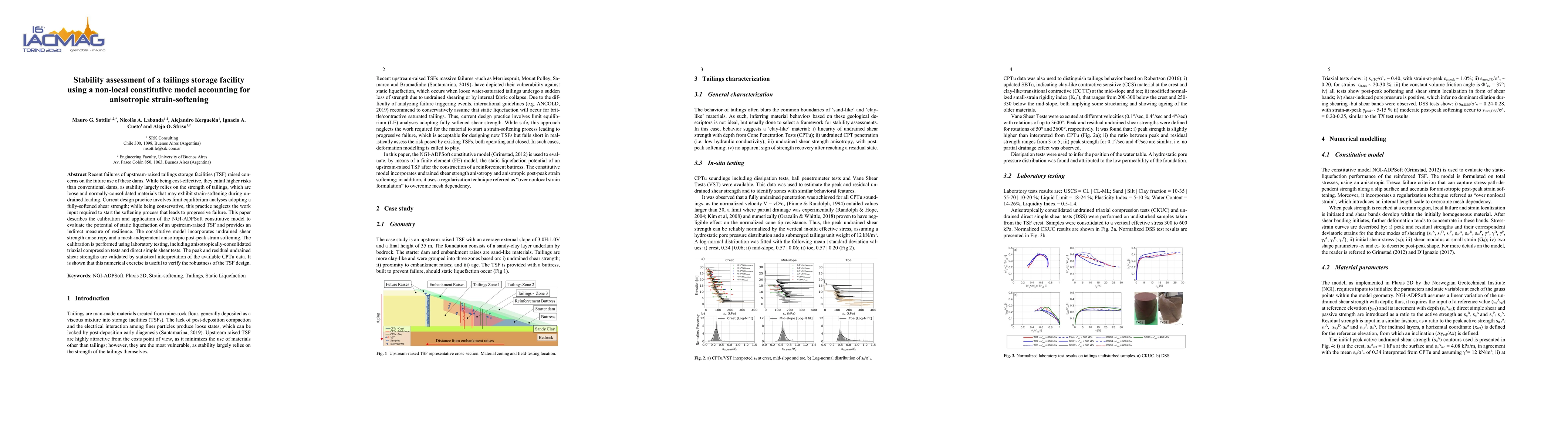 This paper assesses the stability of upstream-raised tailings storage facilities using a non-local constitutive model that accounts for anisotropic strain-softening. The NGI-ADPSoft model is calibrated with laboratory test data to evaluate potential static liquefaction and provide resilience measures, demonstrating its utility for robust TSF design verification.