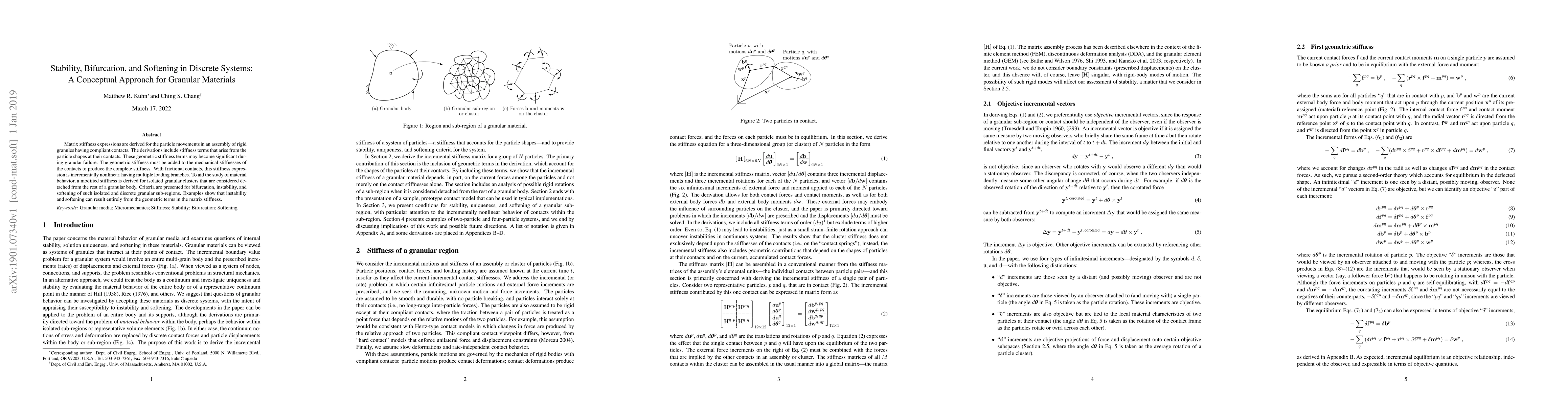 Matrix stiffness expressions are derived for the particle movements in an assembly of rigid granules having compliant contacts. The derivations include stiffness terms that arise from the particle shapes at their contacts. These geometric stiffness terms may become significant during granular failure. The geometric stiffness must be added to the mechanical stiffnesses of the contacts to produce the complete stiffness. With frictional contacts, this stiffness expression is incrementally nonlinear, having multiple loading branches. To aid the study of material behavior, a modified stiffness is derived for isolated granular clusters that are considered detached from the rest of a granular body. Criteria are presented for bifurcation, instability, and softening of such isolated and discrete granular sub-regions. Examples show that instability and softening can result entirely from the geometric terms in the matrix stiffness.