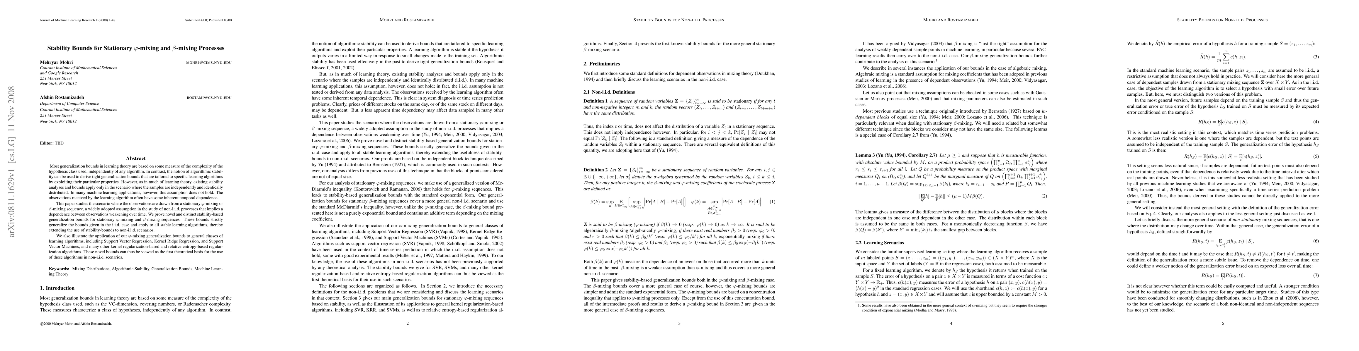 Most generalization bounds in learning theory are based on some measure of the complexity of the hypothesis class used, independently of any algorithm. In contrast, the notion of algorithmic stability can be used to derive tight generalization bounds that are tailored to specific learning algorithms by exploiting their particular properties. However, as in much of learning theory, existing stability analyses and bounds apply only in the scenario where the samples are independently and identically distributed. In many machine learning applications, however, this assumption does not hold. The observations received by the learning algorithm often have some inherent temporal dependence. This paper studies the scenario where the observations are drawn from a stationary phi-mixing or beta-mixing sequence, a widely adopted assumption in the study of non-i.i.d. processes that implies a dependence between observations weakening over time. We prove novel and distinct stability-based generalization bounds for stationary phi-mixing and beta-mixing sequences. These bounds strictly generalize the bounds given in the i.i.d. case and apply to all stable learning algorithms, thereby extending the use of stability-bounds to non-i.i.d. scenarios. We also illustrate the application of our phi-mixing generalization bounds to general classes of learning algorithms, including Support Vector Regression, Kernel Ridge Regression, and Support Vector Machines, and many other kernel regularization-based and relative entropy-based regularization algorithms. These novel bounds can thus be viewed as the first theoretical basis for the use of these algorithms in non-i.i.d. scenarios.