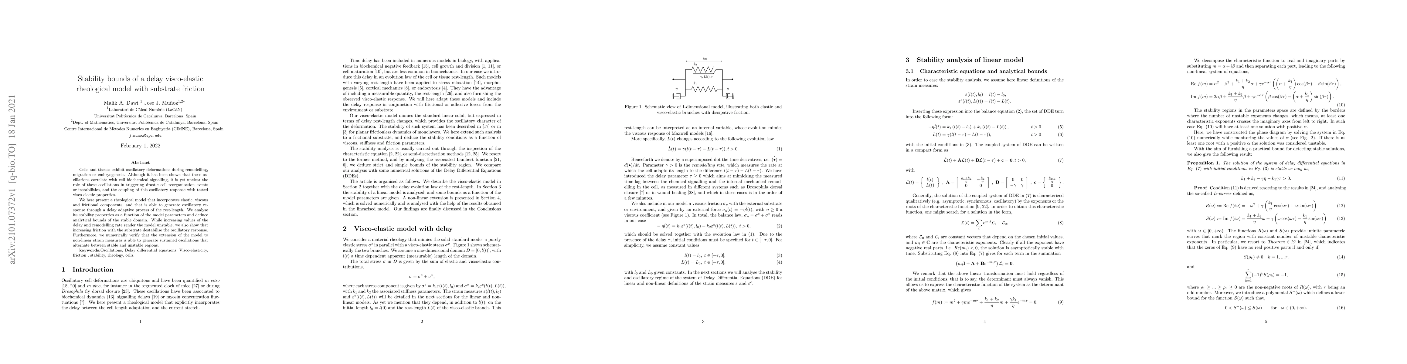 This research introduces a rheological model incorporating elastic, viscous, and frictional components to explain oscillatory cell deformations. It identifies stability bounds through parameter analysis, showing that increased delay, remodelling rate, and friction destabilize the oscillatory response, while non-linear strain measures can generate sustained oscillations alternating between stable and unstable regions.