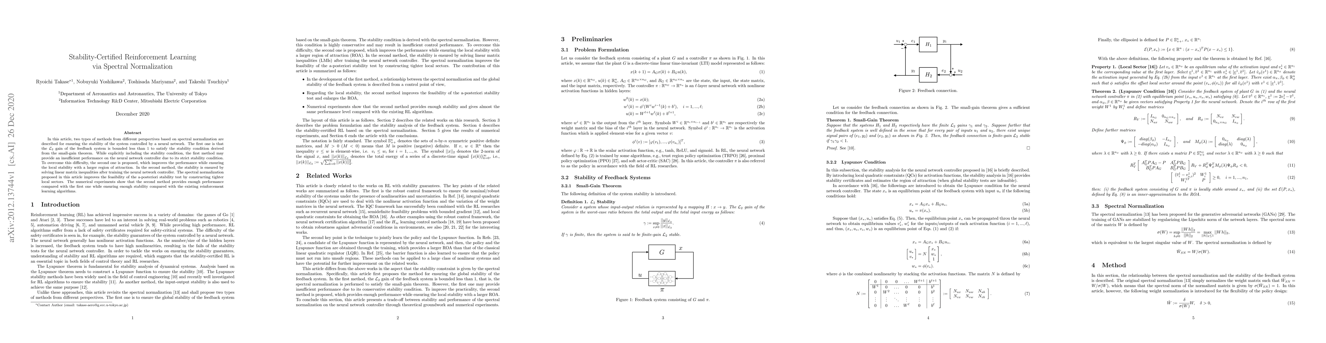 This paper proposes two methods for ensuring stability in reinforcement learning systems using spectral normalization, improving performance while maintaining local stability.
