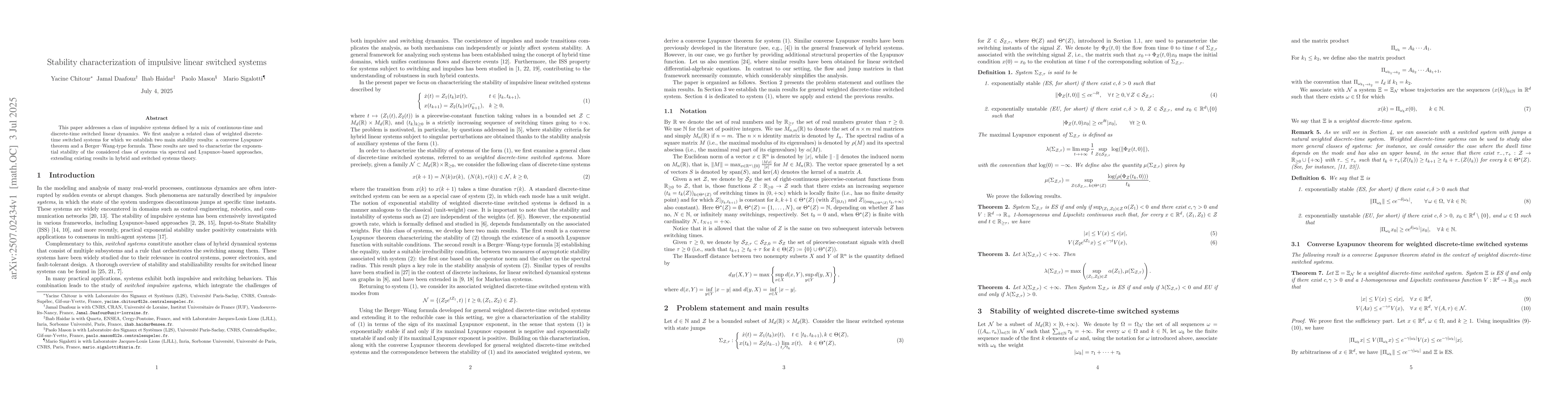 This paper addresses a class of impulsive systems defined by a mix of continuous-time and discrete-time switched linear dynamics. We first analyze a related class of weighted discrete time switched systems for which we establish two main stability results: a converse Lyapunov theorem and a Berger-Wang-type formula. These results are used to characterize the exponential stability of the considered class of systems via spectral and Lyapunov-based approaches, extending existing results in hybrid and switched systems theory.