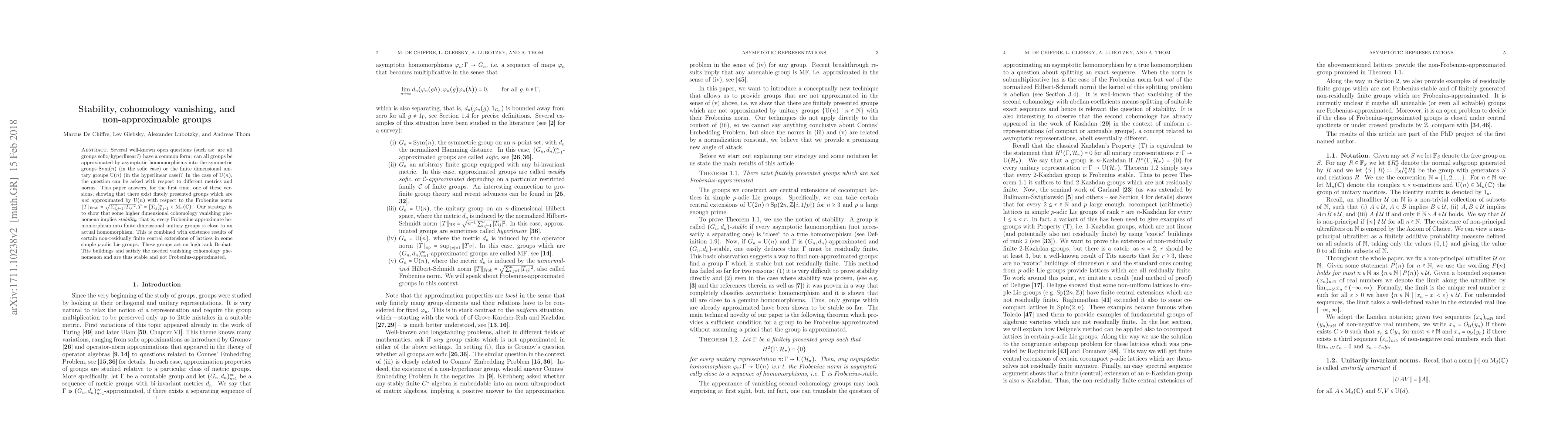 This paper demonstrates the existence of finitely presented groups that cannot be approximated by finite-dimensional unitary groups under the Frobenius norm. The authors achieve this by linking higher dimensional cohomology vanishing to stability, showing that any Frobenius-approximate homomorphism is close to an actual homomorphism, and leveraging non-residually finite central extensions of lattices in simple $p$-adic Lie groups.