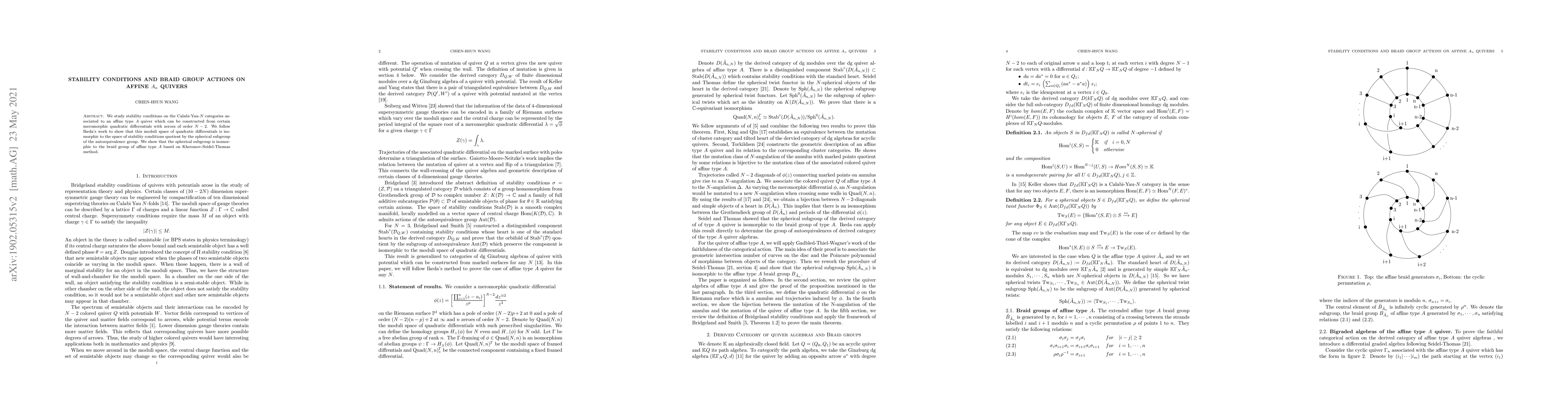 The work bridges algebraic geometry, category theory, and representation theory by associating stability conditions with geometric objects (quadratic differentials) and group actions (braid groups), offering a fresh perspective on the study of Calabi-Yau categories.