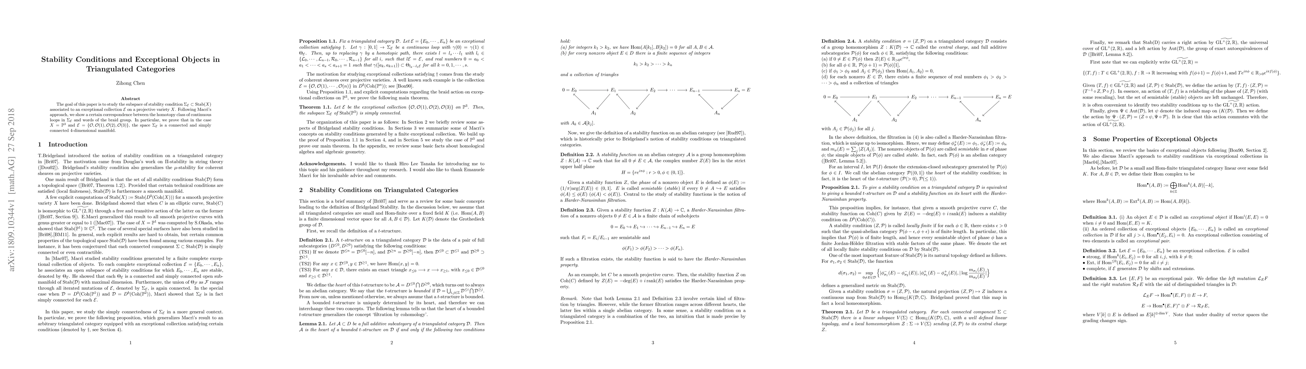 The goal of this paper is to study the subspace of stability condition $\Sigma_{\mathcal{E}}\subset \mathrm{Stab}(X)$ associated to an exceptional collection $\mathcal{E}$ on a projective variety $X$. Following Emanuele Macr\`{i}'s approach, we show a certain correspondence between the homotopy class of continuous loops in $\Sigma_{\mathcal{E}}$ and words of the braid group. In particular, we prove that in the case $X=\mathbb{P}^3$ and $\mathcal{E}=\{\mathcal{O},\mathcal{O}(1),\mathcal{O}(2),\mathcal{O}(3)\}$, the space $\Sigma_{\mathcal{E}}$ is a connected and simply connected 4-dimensional manifold.
