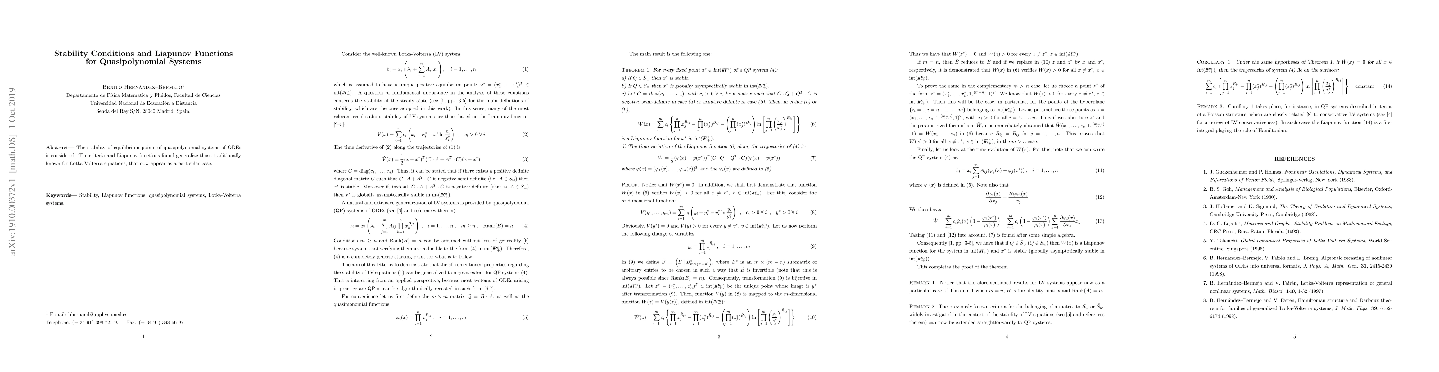 The stability of equilibrium points of quasi-polynomial systems of ODES is considered. The criteria and Liapunov functions found generalize those traditionally known for Lotka-Volterra equatious, that now appear as a particular case.