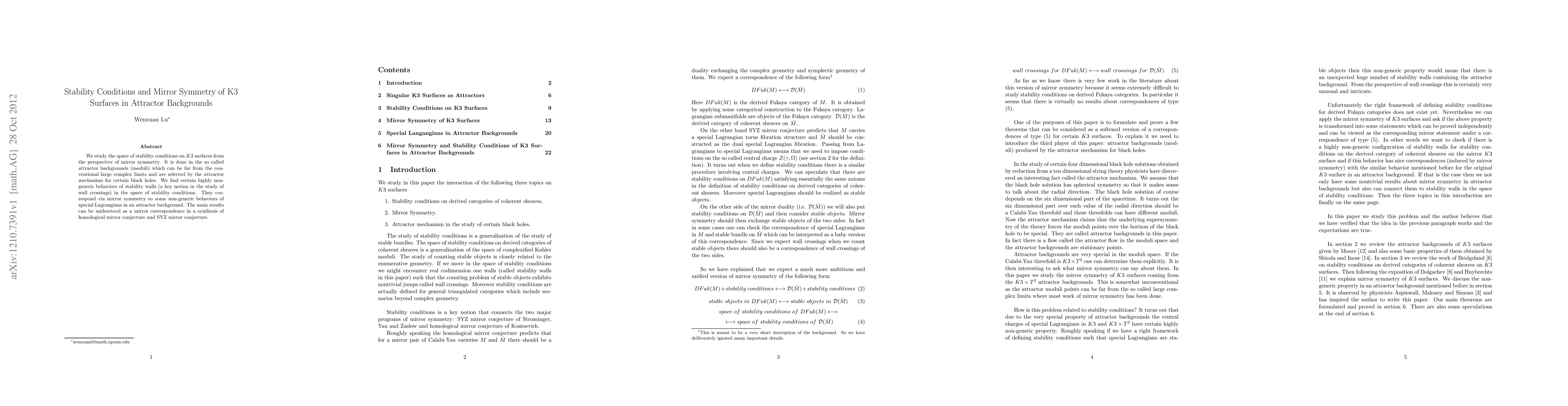 This paper investigates stability conditions on $K3$ surfaces within attractor backgrounds, revealing non-generic behaviors of stability walls linked to special Lagrangians via mirror symmetry. The findings synthesize homological and SYZ mirror conjectures.