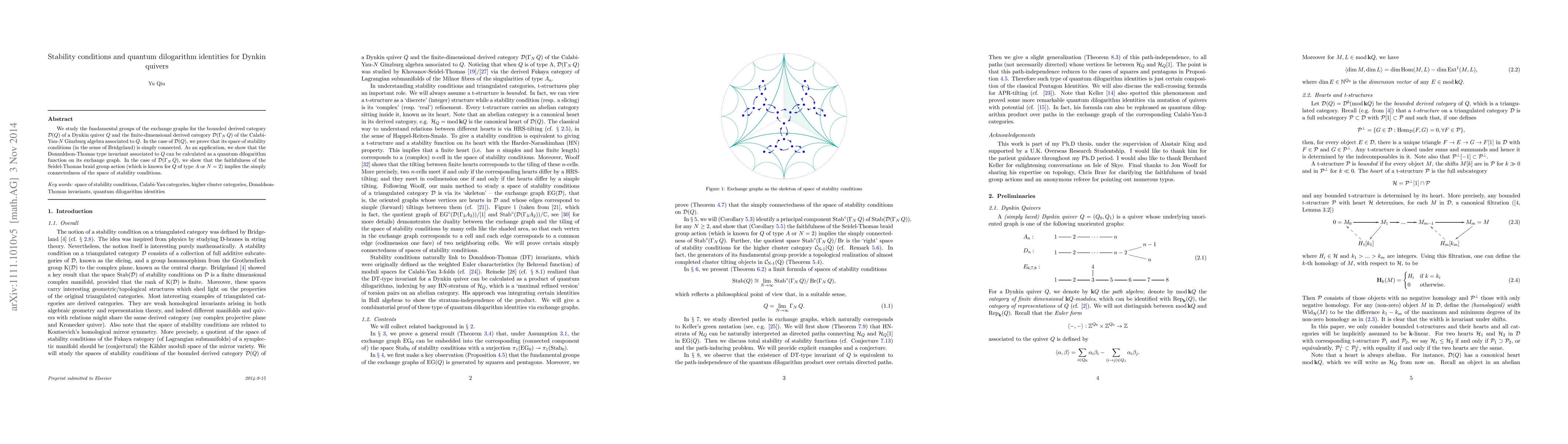 This paper investigates the fundamental group of stability conditions for the derived categories of Dynkin quivers and their associated Calabi-Yau-N Ginzburg algebras, proving the simply connectedness of these spaces and linking the Donaldson-Thomas invariants to quantum dilogarithm identities.