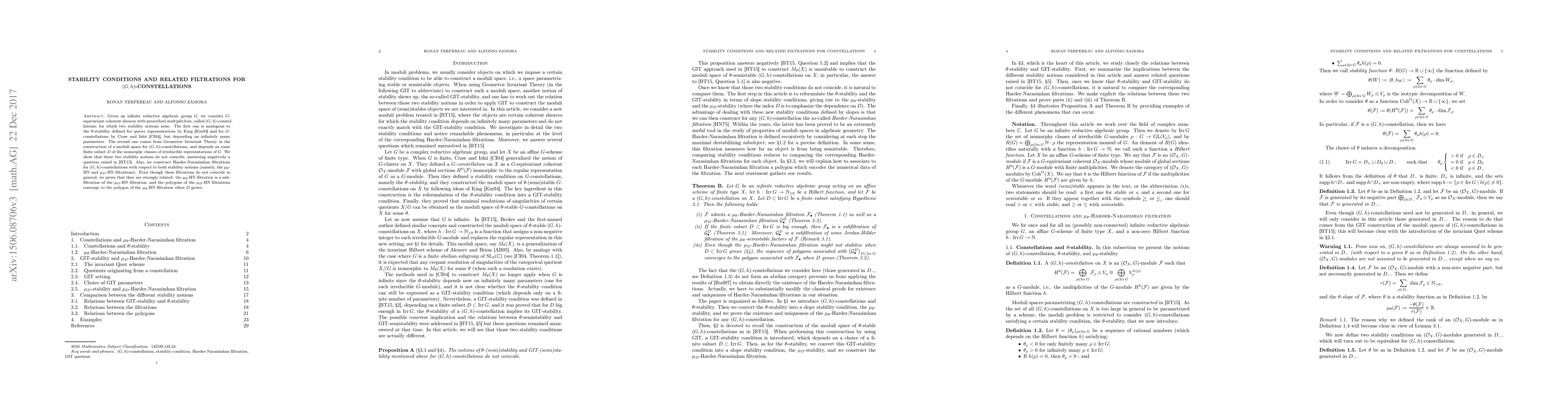 Given an infinite reductive algebraic group $G$, we consider $G$-equivariant coherent sheaves with prescribed multiplicities, called $(G,h)$-constellations, for which two stability notions arise. The first one is analogous to the $\theta$-stability defined for quiver representations by King and for $G$-constellations by Craw and Ishii, but depending on infinitely many parameters. The second one comes from Geometric Invariant Theory in the construction of a moduli space for $(G,h)$-constellations, and depends on some finite subset $D$ of the isomorphy classes of irreducible representations of $G$. We show that these two stability notions do not coincide, answering negatively a question raised in [BT15]. Also, we construct Harder-Narasimhan filtrations for $(G,h)$-constellations with respect to both stability notions (namely, the $\mu_{\theta}$-HN and $\mu_D$-HN filtrations). Even though these filtrations do not coincide in general, we prove that they are strongly related: the $\mu_{\theta}$-HN filtration is a subfiltration of the $\mu_D$-HN filtration, and the polygons of the $\mu_D$-HN filtrations converge to the polygon of the $\mu_{\theta}$-HN filtration when $D$ grows.
