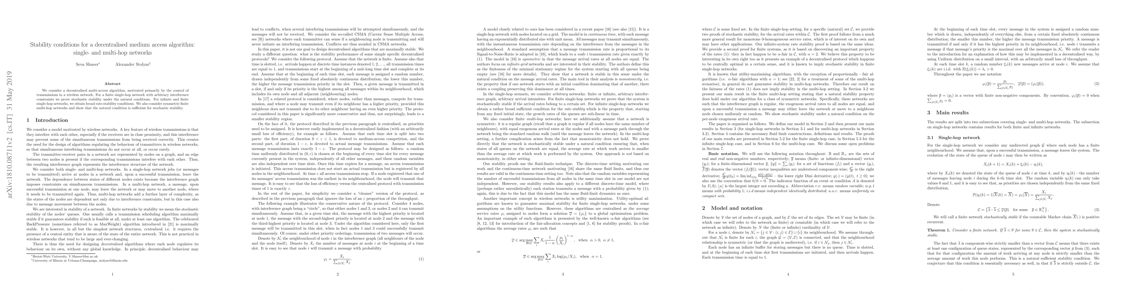 This paper investigates the stability conditions for a decentralised multi-access algorithm in wireless networks, proving stochastic stability for finite single-hop networks and establishing broad rate-stability conditions for both infinite and finite single-hop networks. It also demonstrates that the natural condition suffices for stochastic stability in symmetric finite multi-hop networks.