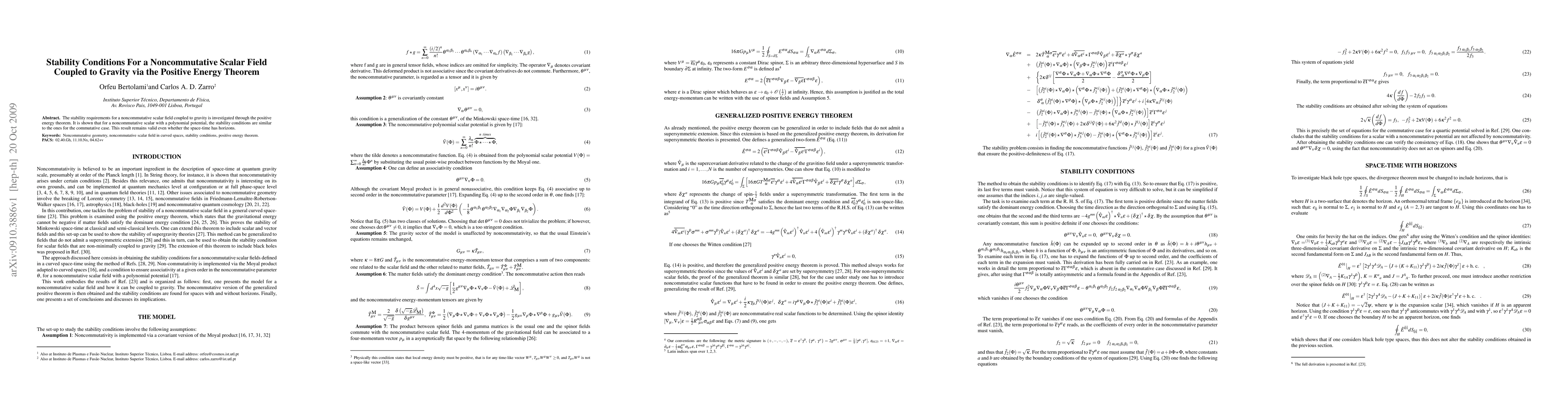 The stability requirements for a noncommutative scalar field coupled to gravity is investigated through the positive energy theorem. It is shown that for a noncommutative scalar with a polynomial potential, the stability conditions are similar to the ones for the commutative case. This result remains valid even whether the space-time has horizons.
