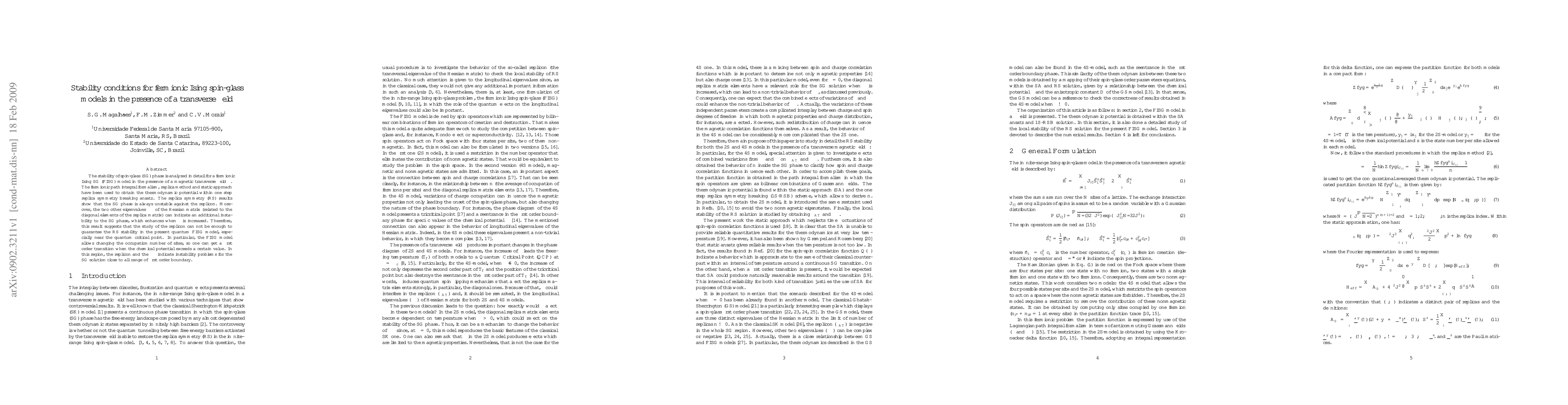 The stability of spin-glass (SG) phase is analyzed in detail for a fermionic Ising SG (FISG) model in the presence of a magnetic transverse field $\Gamma$. The fermionic path integral formalism, replica method and static approach have been used to obtain the thermodynamic potential within one step replica symmetry breaking ansatz. The replica symmetry (RS) results show that the SG phase is always unstable against the replicon. Moreover, the two other eigenvalues $\lambda_{\pm}$ of the Hessian matrix (related to the diagonal elements of the replica matrix) can indicate an additional instability to the SG phase, which enhances when $\Gamma$ is increased. Therefore, this result suggests that the study of the replicon can not be enough to guarantee the RS stability in the present quantum FISG model, especially near the quantum critical point. In particular, the FISG model allows changing the occupation number of sites, so one can get a first order transition when the chemical potential exceeds a certain value. In this region, the replicon and the $\lambda_{\pm}$ indicate instability problems for the SG solution close to all range of first order boundary.