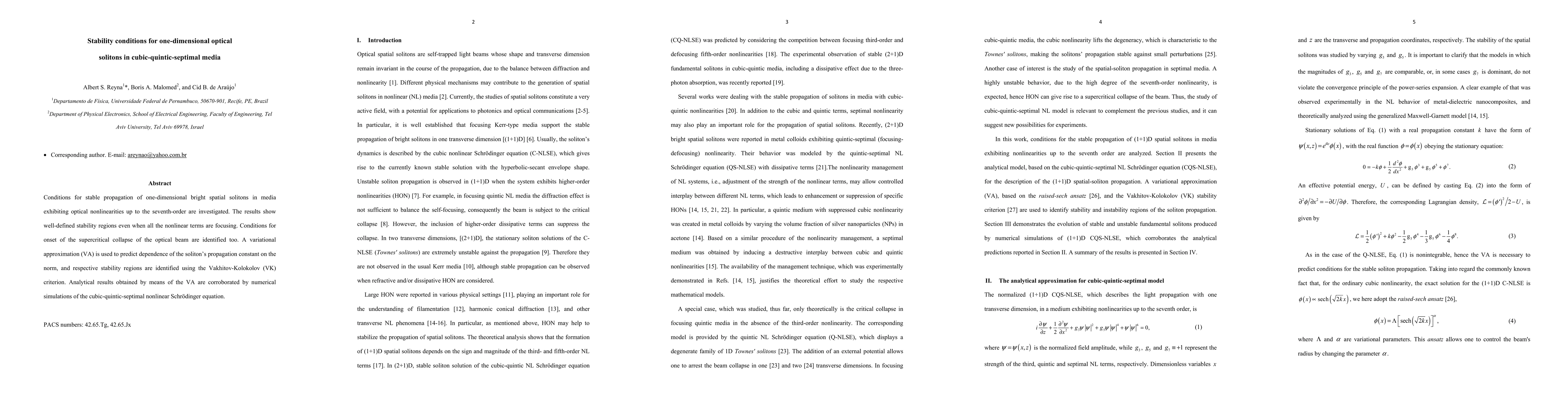 This research investigates conditions for stable propagation of one-dimensional optical solitons in media with up to seventh-order nonlinearities, identifying stability regions and conditions for beam collapse.
