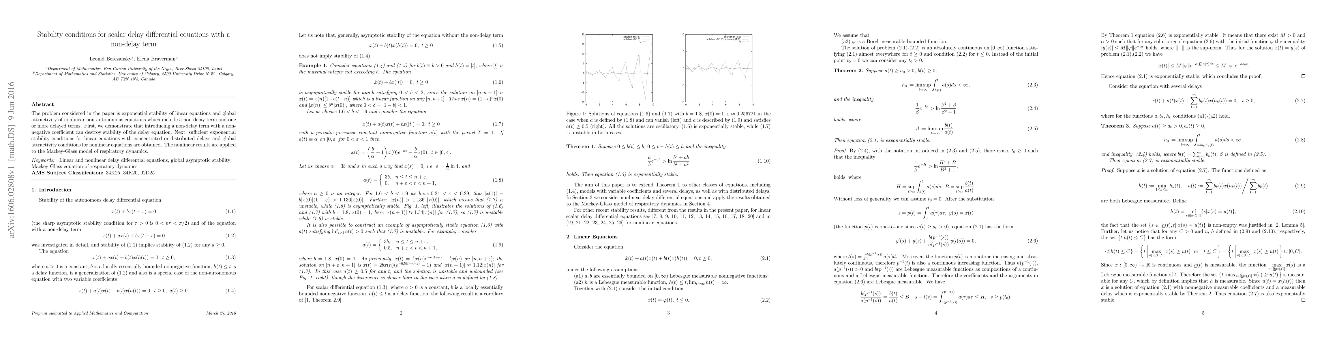This paper investigates exponential stability conditions for linear scalar delay differential equations with a non-delay term and global attractivity conditions for nonlinear non-autonomous equations with delays. It finds that a non-delay term can disrupt stability and provides sufficient conditions for stability in both linear and nonlinear cases, applying the nonlinear results to the Mackey-Glass model.