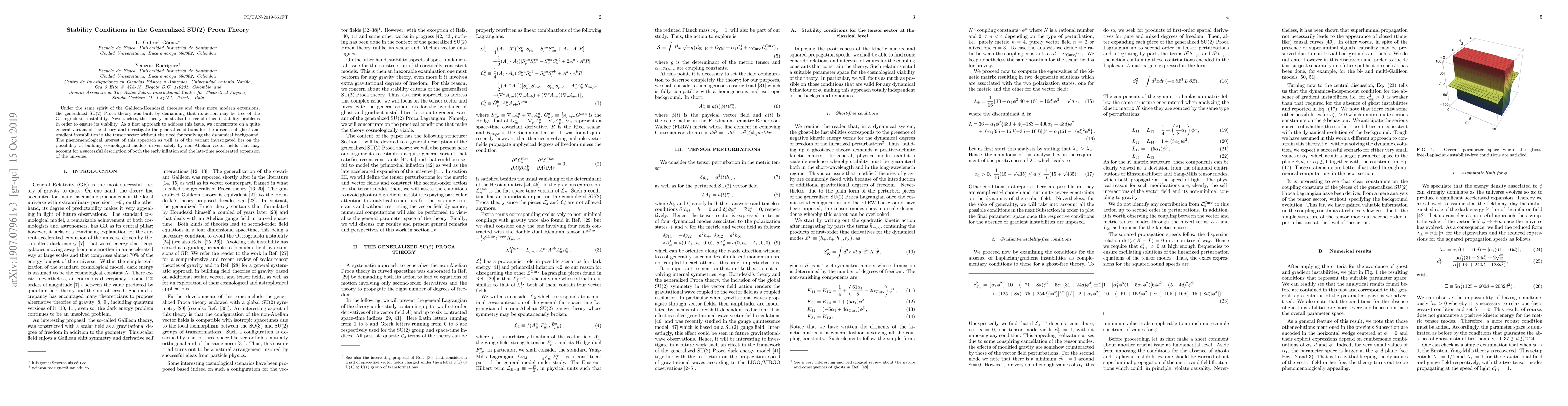 The generalized SU(2) Proca theory is investigated for stability conditions to prevent ghost and gradient instabilities without resolving the dynamical background, with implications for cosmological models of early inflation and late-time accelerated expansion.