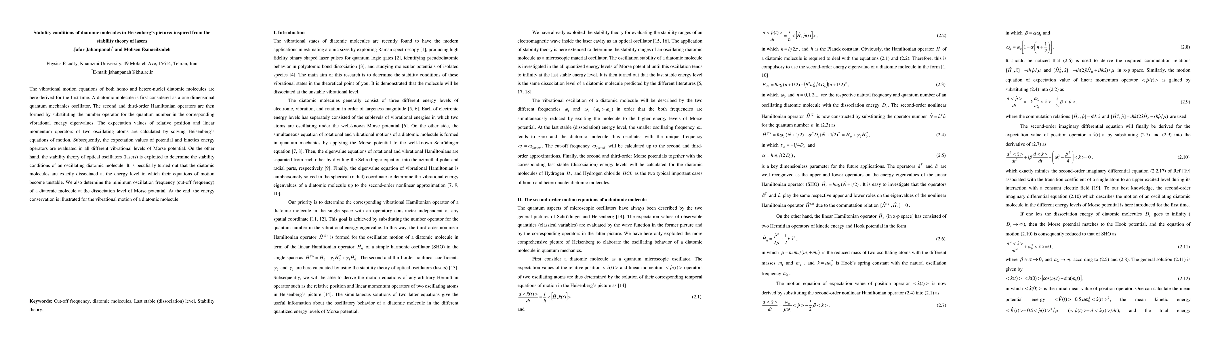 The vibrational motion equations of both homo and hetero-nuclei diatomic molecules are here derived for the first time. A diatomic molecule is first considered as a one dimensional quantum mechanics oscillator. The second and third-order Hamiltonian operators are then formed by substituting the number operator for the quantum number in the corresponding vibrational energy eigenvalues. The expectation values of relative position and linear momentum operators of two oscillating atoms are calculated by solving Heisenbergs equations of motion. Subsequently, the expectation values of potential and kinetics energy operators are evaluated in all different vibrational levels of Morse potential. On the other hand, the stability theory of optical oscillators (lasers) is exploited to determine the stability conditions of an oscillating diatomic molecule.It is peculiarly turned out that the diatomic molecules are exactly dissociated at the energy level in which their equations of motion become unstable. We also determine the minimum oscillation frequency (cut-off frequency) of a diatomic molecule at the dissociation level of Morse potential. At the end, the energy conservation is illustrated for the vibrational motion of a diatomic molecule.