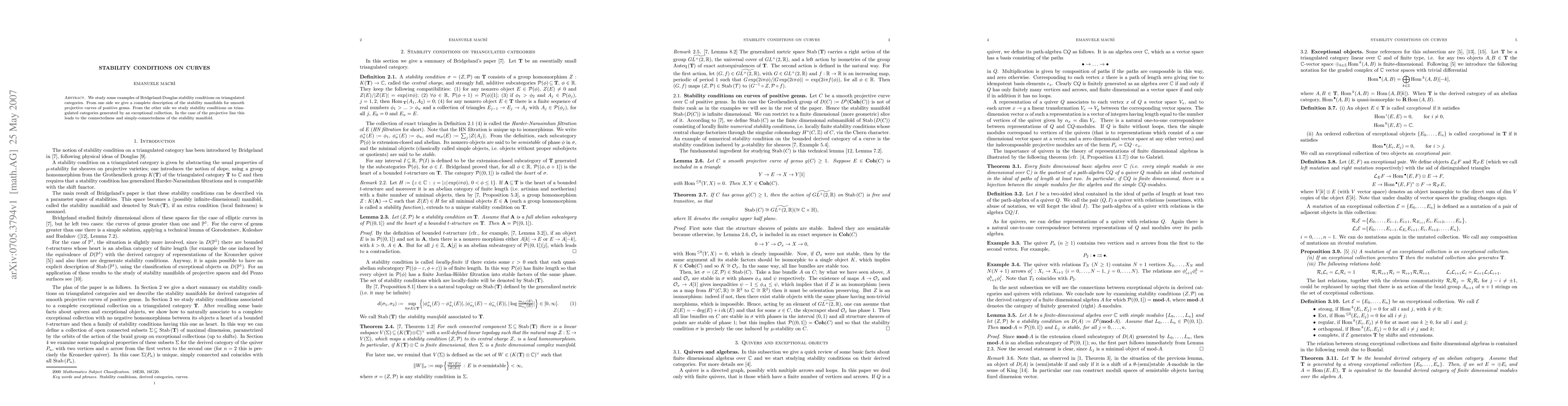 This paper provides a detailed examination of Bridgeland-Douglas stability conditions on triangulated categories, focusing on smooth projective curves of positive genus and exploring stability conditions generated by exceptional collections, revealing the connectedness and simply-connectedness of the stability manifold for the projective line.