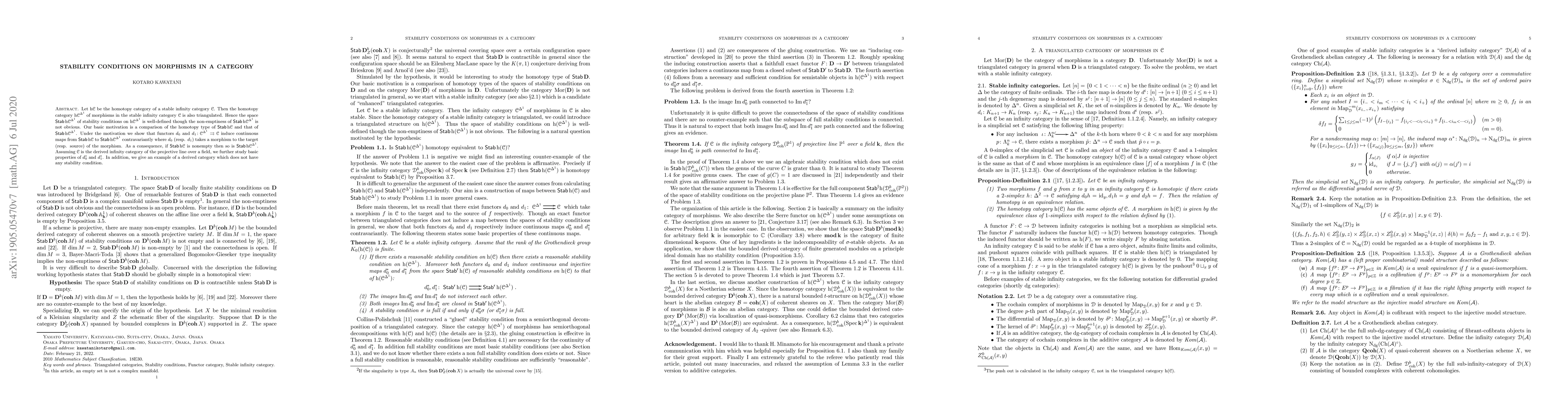 Let $\mathrm{h}\mathscr{C}$ be the homotopy category of a stable infinity category $\mathscr{C}$. Then the homotopy category $\mathrm{h}\mathscr{C}^{\Delta^{1}}$ of morphisms in the stable infinity category $\mathscr{C}$ is also triangulated. Hence the space $\mathsf{Stab}\,{ \mathrm{h}\mathscr{C}^{\Delta^{1}}}$ of stability conditions on $\mathrm{h}\mathscr{C}^{\Delta^{1}}$ is well-defined though the non-emptiness of $\mathsf{Stab}\,{ \mathrm{h}\mathscr{C}^{\Delta^{1}}}$ is not obvious. Our basic motivation is a comparison of the homotopy type of $\mathsf{Stab}{\mathrm{h}\mathscr{C}}$ and that of $\mathsf{Stab}{\mathrm{h}\mathscr{C}^{\Delta^{1}}}$. Under the motivation we show that functors $d_{0}$ and $d_{1} \colon \mathscr{C}^{\Delta^{1}} \rightrightarrows \mathscr{C}$ induce continuous maps from $\mathsf{Stab} {\mathrm{h}\mathscr{C}}$ to $\mathsf{Stab}{\mathrm{h}\mathscr{C}^{\Delta^{1}}}$ contravariantly where $d_{0}$ (resp. $d_{1}$) takes a morphism to the target (resp. source) of the morphism. As a consequence, if $\mathsf{Stab}{\mathrm{h}\mathscr{C}}$ is nonempty then so is $\mathsf{Stab}{\mathrm{h}\mathscr{C}^{\Delta^{1}}}$. Assuming $\mathscr{C}$ is the derived infinity category of the projective line over a field, we further study basic properties of $d_{0}^{*} $ and $d_{1}^{*}$. In addition, we give an example of a derived category which does not have any stability condition.