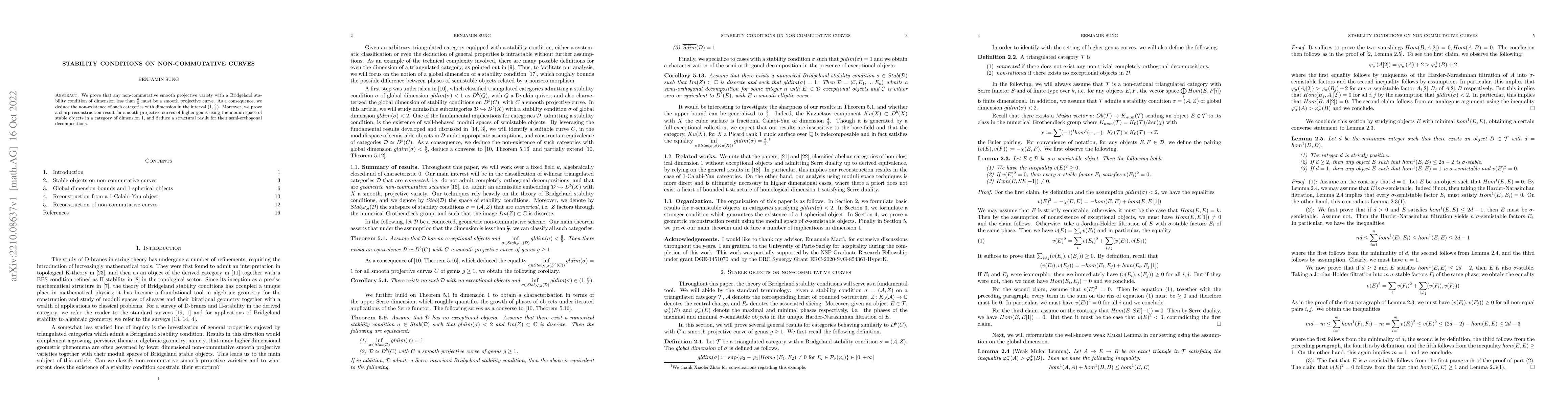 This paper proves that non-commutative smooth projective varieties with a Bridgeland stability condition of dimension less than $\frac{6}{5}$ must be curves, establishing the non-existence of such categories with dimensions in the interval $(1,\frac{6}{5})$. It also reconstructs smooth projective curves of higher genus using moduli spaces and analyzes their semi-orthogonal decompositions.
