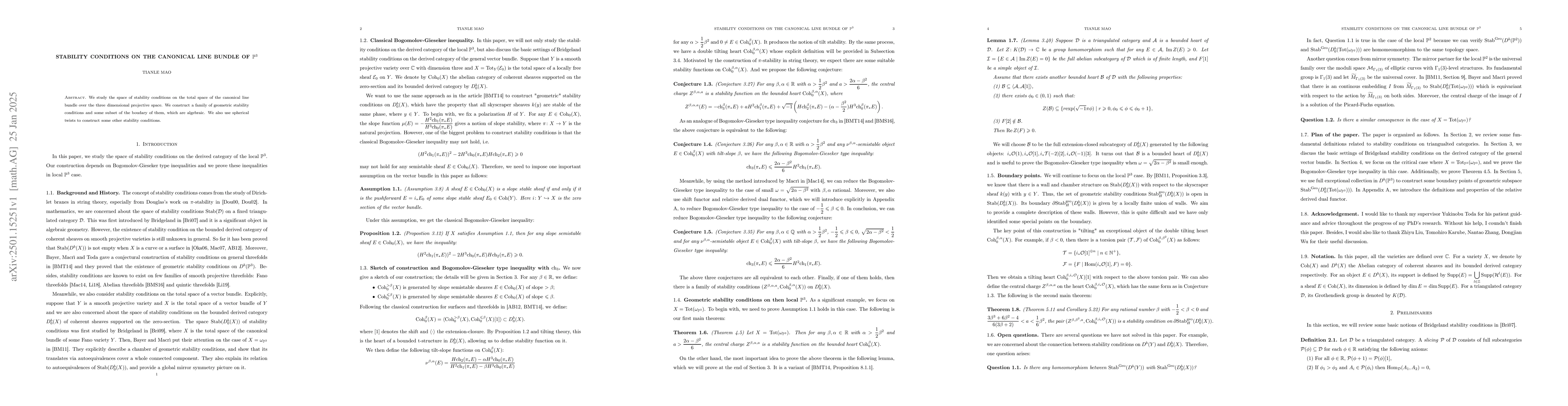 This paper investigates stability conditions on the canonical line bundle over $\mathbb{P}^3$, constructing a family of geometric stability conditions and identifying an algebraic subset at their boundary. It also employs spherical twists to create additional stability conditions.