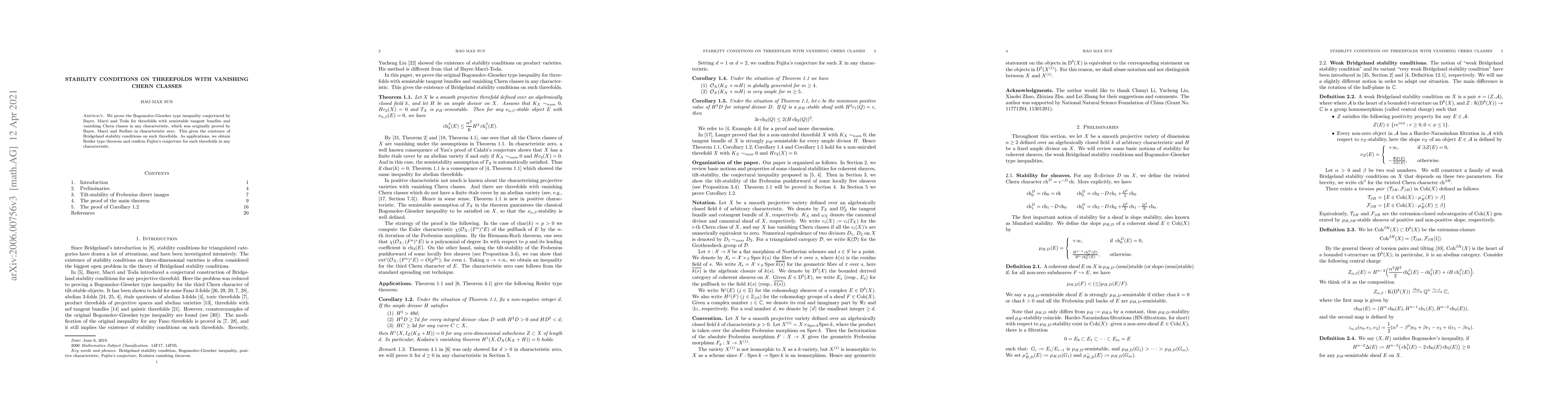 This paper proves the Bogomolov-Gieseker inequality for threefolds with semistable tangent bundles and vanishing Chern classes in any characteristic, establishing Bridgeland stability conditions. It also confirms Fujita's conjecture and Reider type theorems for these threefolds.