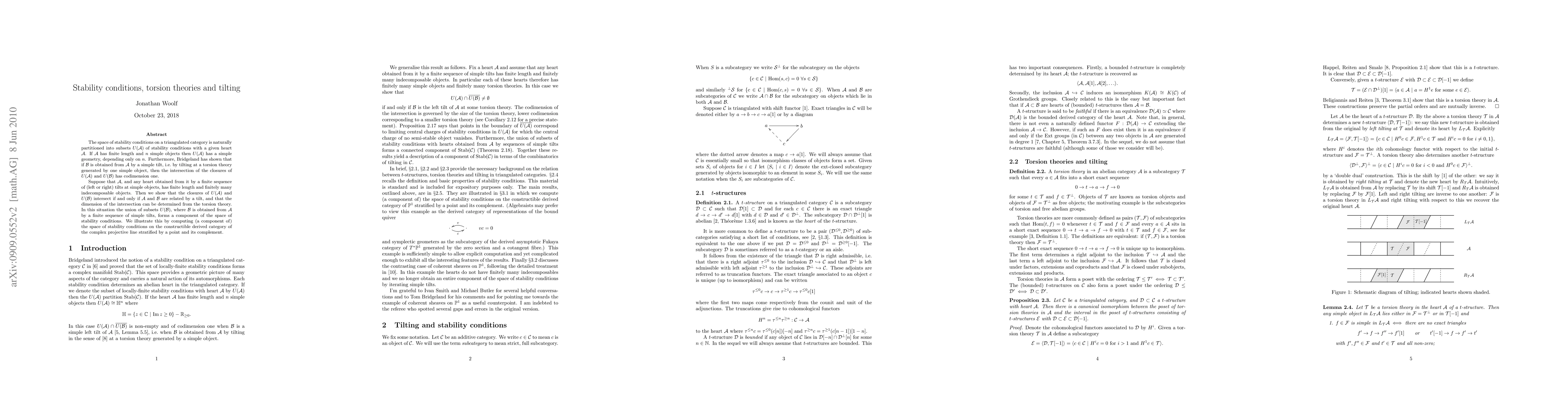 This research explores the geometry of stability conditions in triangulated categories, partitioning them into subsets based on hearts. It reveals that the closures of these subsets intersect with codimension one when related by a simple tilt, and determines the dimension of intersection from the torsion theory. The study further shows that a union of such subsets forms a component of the stability conditions space, illustrated by computing a component of the space of stability conditions on the constructible derived category of the complex projective line stratified by a point and its complement.