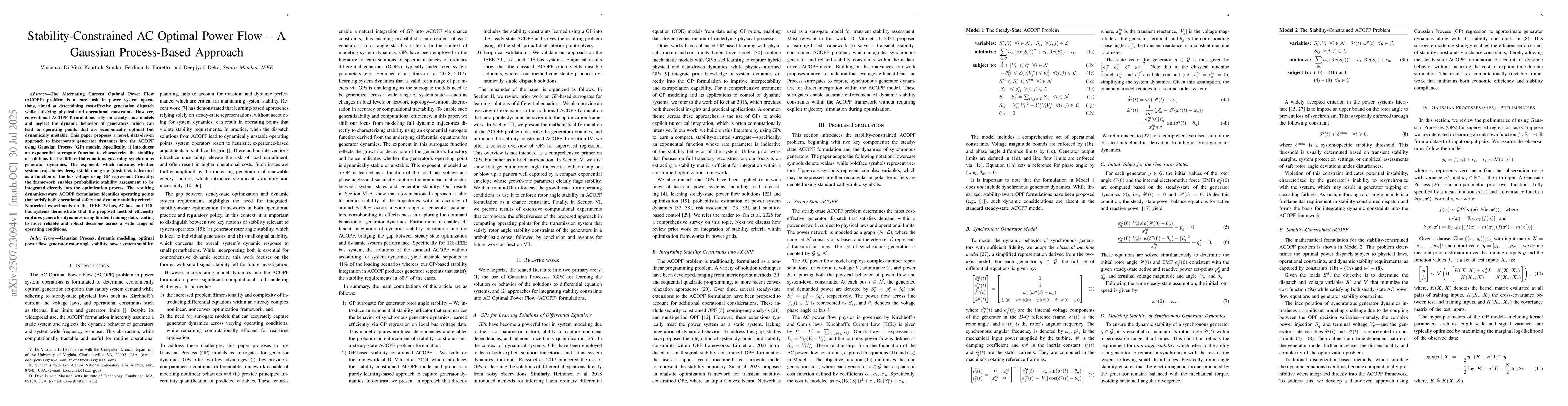 The Alternating Current Optimal Power Flow (ACOPF) problem is a core task in power system operations, aimed at determining cost-effective generation dispatch while satisfying physical and operational constraints. However, conventional ACOPF formulations rely on steady-state models and neglect the dynamic behavior of generators, which can lead to operating points that are economically optimal but dynamically unstable. This paper proposes a novel, data-driven approach to incorporate generator dynamics into the ACOPF using Gaussian Process (GP) models. Specifically, it introduces an exponential surrogate function to characterize the stability of solutions to the differential equations governing synchronous generator dynamics. The exponent, which indicates whether system trajectories decay (stable) or grow (unstable), is learned as a function of the bus voltage using GP regression. Crucially, the framework enables probabilistic stability assessment to be integrated directly into the optimization process. The resulting dynamics-aware ACOPF formulation identifies operating points that satisfy both operational safety and dynamic stability criteria. Numerical experiments on the IEEE 39-bus, 57-bus, and 118-bus systems demonstrate that the proposed method efficiently captures generator dynamics using limited training data, leading to more reliable and robust decisions across a wide range of operating conditions.