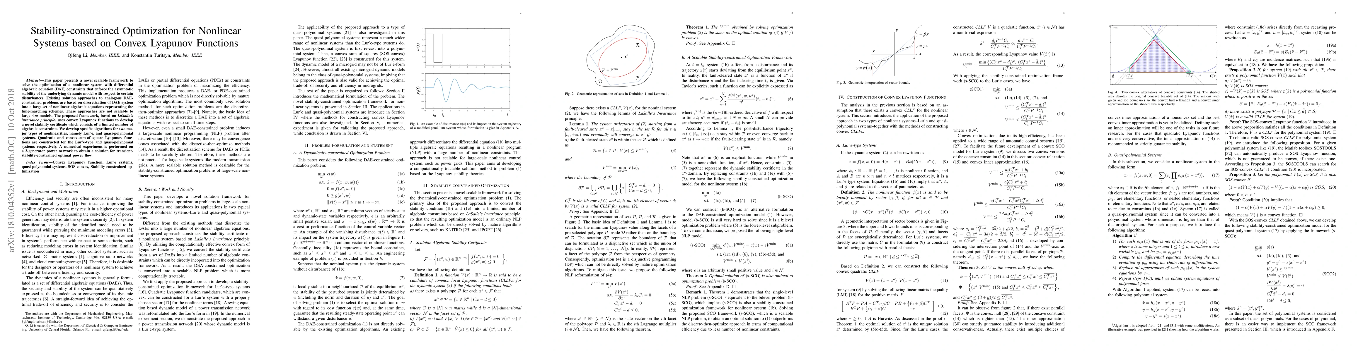 This paper introduces a scalable optimization framework for nonlinear systems using convex Lyapunov functions to ensure stability, avoiding the large-scale discretization of differential algebraic equations. It develops algorithms for Lur'e and quasi-polynomial systems, demonstrated through a transient-stability-constrained optimal power flow on a 3-generator power network.
