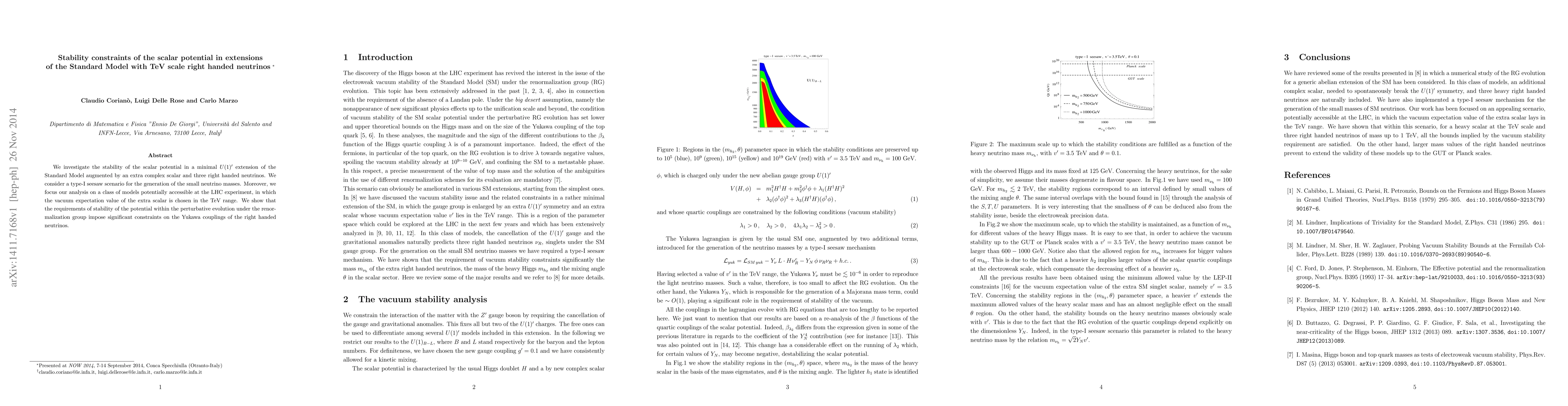 This paper examines the stability of the scalar potential in a $U(1)'$ extended Standard Model with TeV scale right-handed neutrinos, focusing on a type-I seesaw mechanism. It finds that perturbative stability under the renormalization group imposes significant constraints on the Yukawa couplings of the right-handed neutrinos.