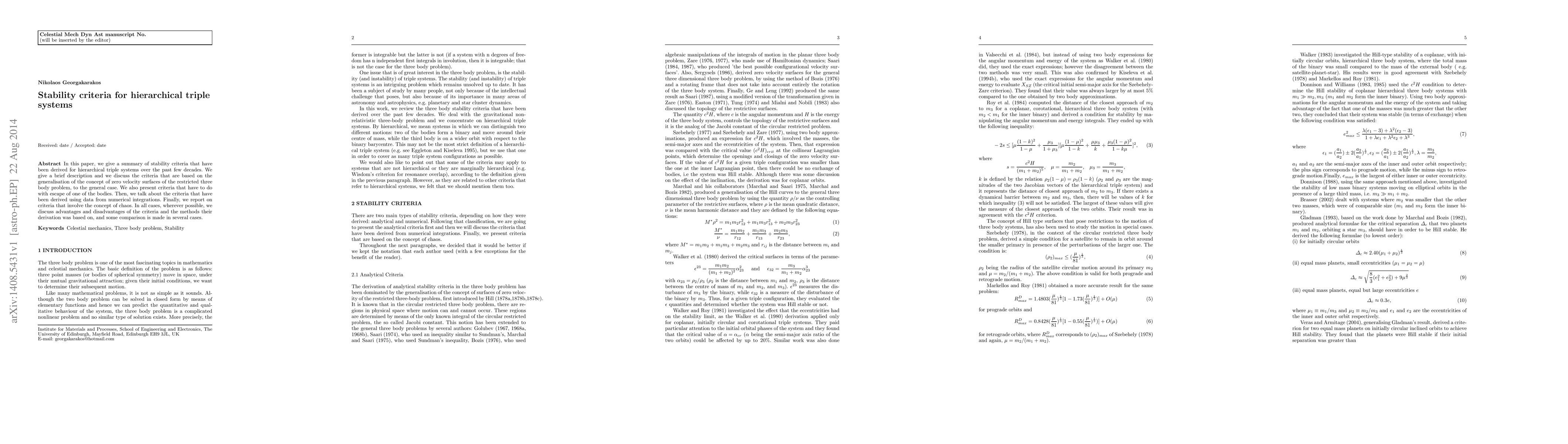 This paper reviews stability criteria for hierarchical triple star systems, discussing criteria based on zero velocity surfaces, escape dynamics, numerical integration, and chaos. It evaluates the advantages and disadvantages of each method and compares them where applicable.