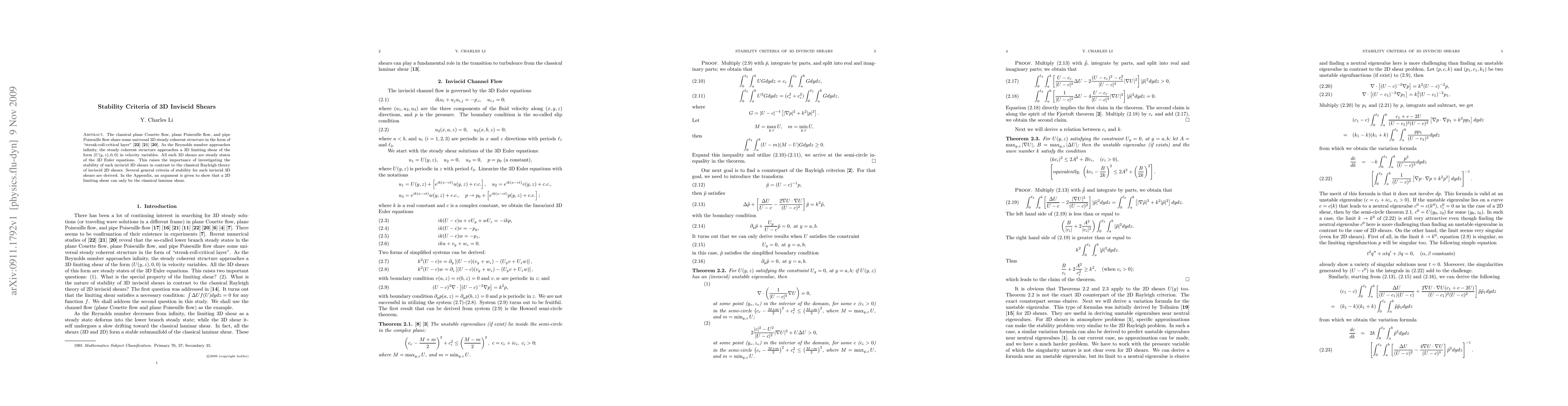 This paper investigates the stability criteria for 3D inviscid shear flows, focusing on the universal "streak-roll-critical layer" structure. It derives general stability criteria for these shears, contrasting with classical Rayleigh theory for 2D shears, and concludes that 2D limiting shears are classical laminar shears.