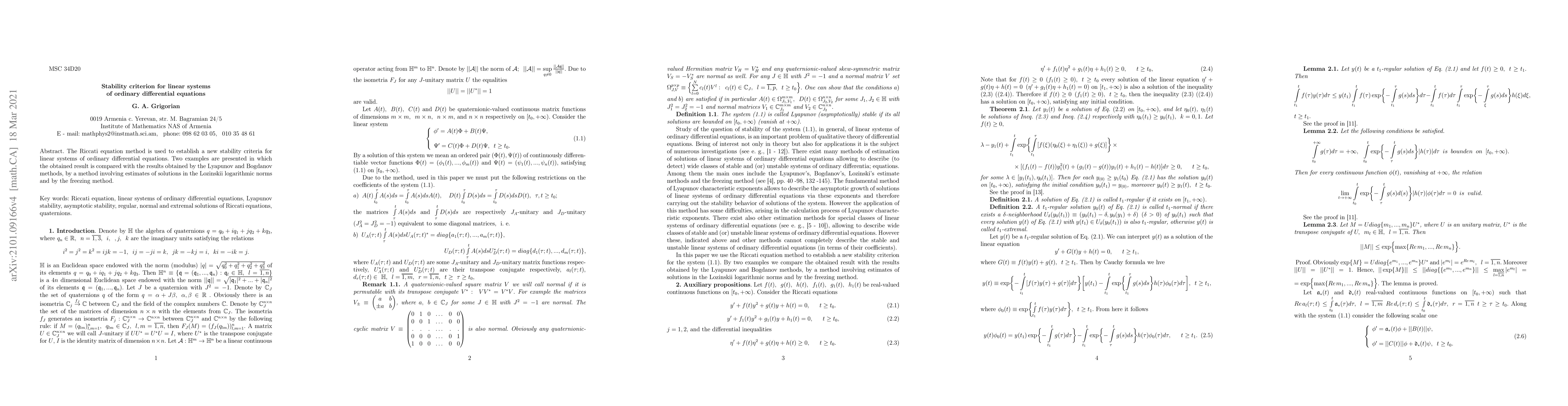 This paper introduces a new stability criterion for linear systems of ordinary differential equations using the Riccati equation method, and compares its effectiveness with Lyapunov, Bogdanov, Lozinskii logarithmic norms, and freezing methods through two illustrative examples.