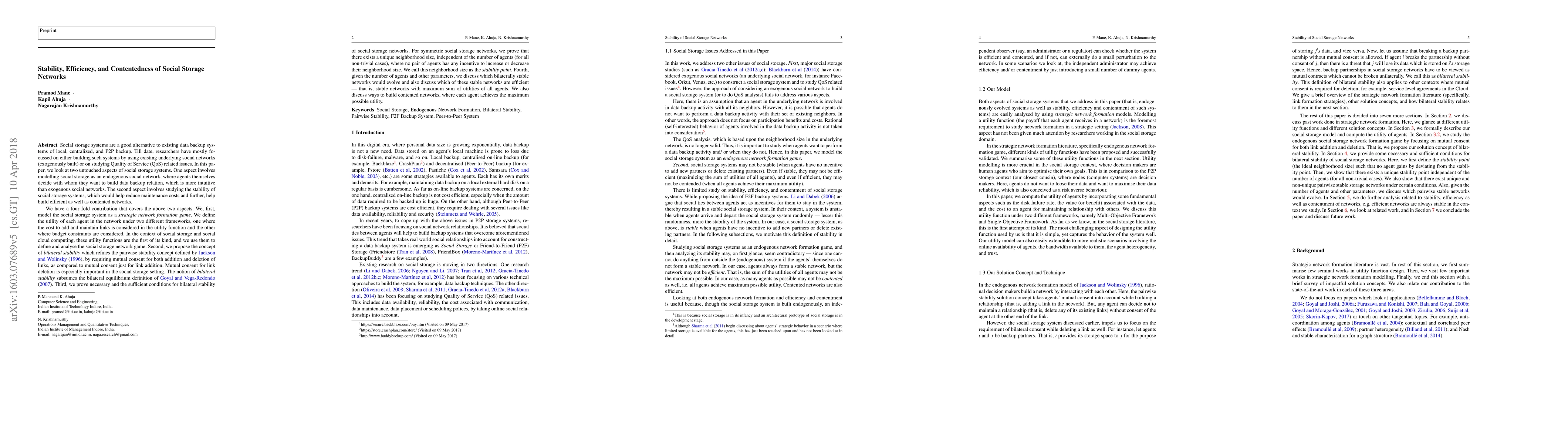 Social storage systems are a good alternative to existing data backup systems of local, centralized, and P2P backup. In this paper, we look at two untouched aspects of social storage systems. One aspect involves modelling social storage as an endogenous social network, where agents themselves decide with whom they want to build data backup relation. The second aspect involves studying the stability of social storage systems, which would help reduce maintenance costs and further, help build efficient as well as contented networks. We have a four fold contribution that covers the above two aspects. We, first, model the social storage system as a strategic network formation game. We define the utility of each agent in the network under two different frameworks. Second, we propose the concept of bilateral stability which refines the pairwise stability concept defined by Jackson et. al. 1996, by requiring mutual consent for both addition and deletion of links, as compared to mutual consent just for link addition. Mutual consent for link deletion is especially important in the social storage setting. Third, we prove necessary and the sufficient conditions for bilateral stability of social storage networks. For symmetric social storage networks, we prove that there exists a unique neighborhood size, independent of the number of agents (for all non-trivial cases), where no pair of agents has any incentive to increase or decrease their neighborhood size. We call this neighborhood size as the stability point. Fourth, given the number of agents and other parameters, we discuss which bilaterally stable networks would evolve and also discuss which of these stable networks are efficient --- that is, stable networks with maximum sum of utilities of all agents. We also discuss ways to build contented networks, where each agent achieves the maximum possible utility.