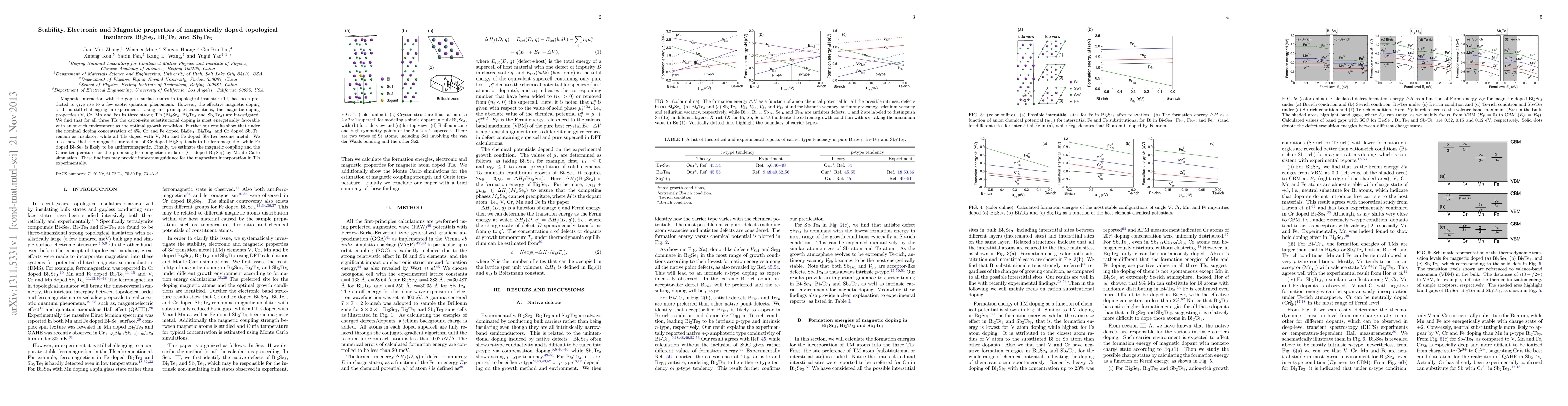 This paper investigates the stability, electronic, and magnetic properties of magnetically doped topological insulators (Bi$_{2}$Se$_{3}$, Bi$_{2}$Te$_{3}$, and Sb$_{2}$Te$_{3}$) using first-principles calculations. It finds that cation-site substitutional doping with Cr and Fe is energetically favorable, leading to distinct magnetic properties and electrical conductivity changes in the doped TIs.