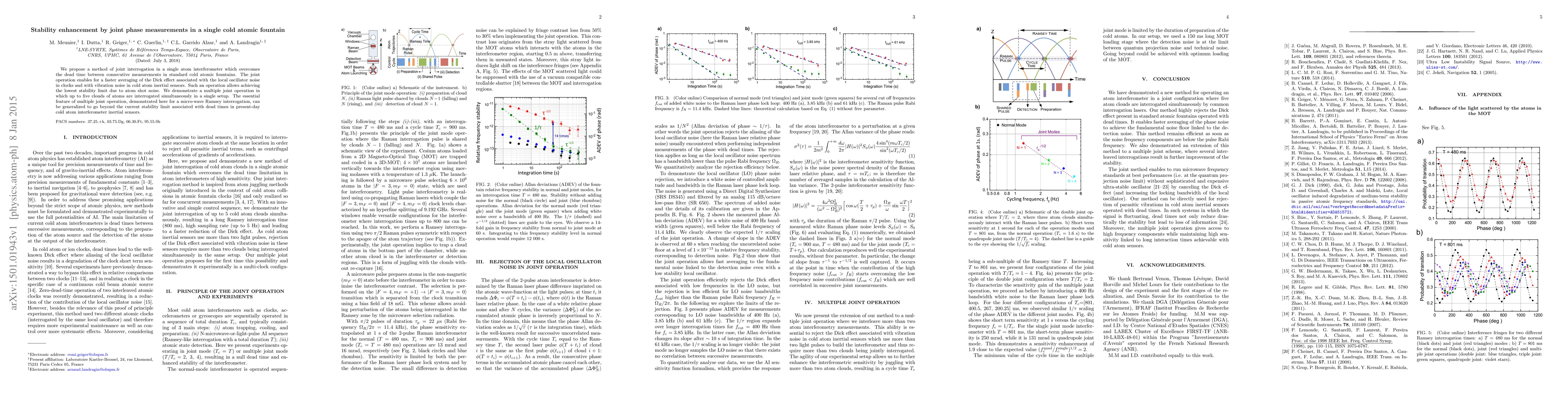 We propose a method of joint interrogation in a single atom interferometer which overcomes the dead time between consecutive measurements in standard cold atomic fountains. The joint operation enables for a faster averaging of the Dick effect associated with the local oscillator noise in clocks and with vibration noise in cold atom inertial sensors. Such an operation allows achieving the lowest stability limit due to atom shot noise. We demonstrate a multiple joint operation in which up to five clouds of atoms are interrogated simultaneously in a single setup. The essential feature of multiple joint operation, demonstrated here for a micro-wave Ramsey interrogation, can be generalized to go beyond the current stability limit associated with dead times in present-day cold atom interferometer inertial sensors.