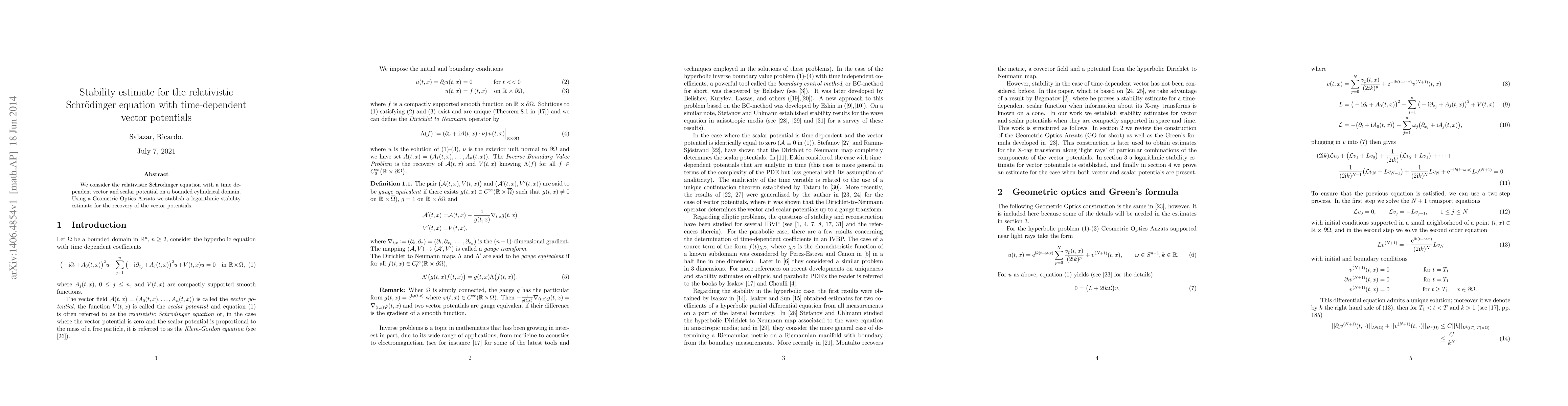We consider the relativistic Schr\"odinger equation with a time dependent vector and scalar potential on a bounded cylindrical domain. Using a Geometric Optics Ansatz we establish a logarithmic stability estimate for the recovery of the vector and scalar potentials.