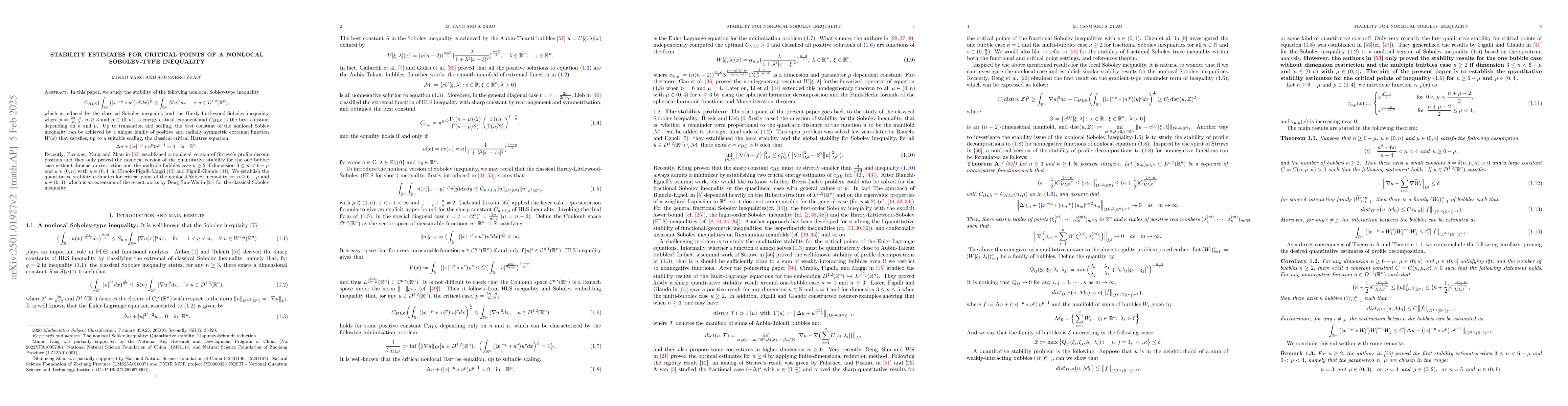 This paper establishes quantitative stability estimates for critical points of a nonlocal Sobolev-type inequality, focusing on the unique extremal function W(x) that solves the associated Euler-Lagrange equation. The results apply for dimensions n ≥ 6−μ and parameter μ in (0,4).
