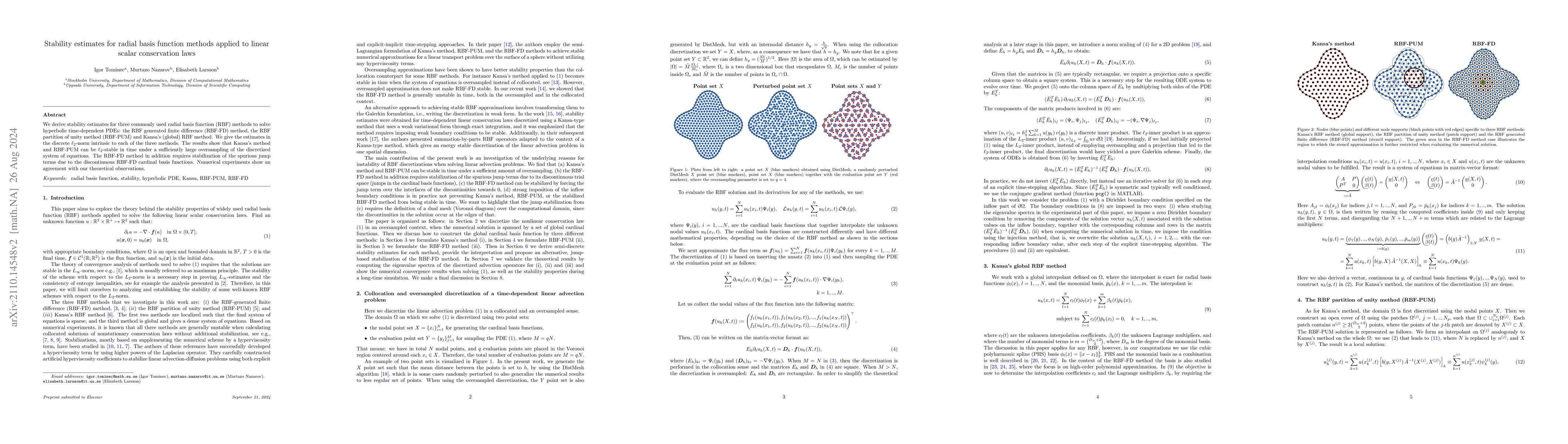 This paper derives stability estimates for three radial basis function (RBF) methods applied to hyperbolic time-dependent PDEs: RBF-FD, RBF-PUM, and Kansa's method. It shows that RBF-PUM and Kansa's methods can be $\ell_2$-stable with sufficient oversampling, while RBF-FD is inherently unstable due to basis function discontinuities. A stabilization technique for RBF-FD is proposed, validated by numerical experiments.