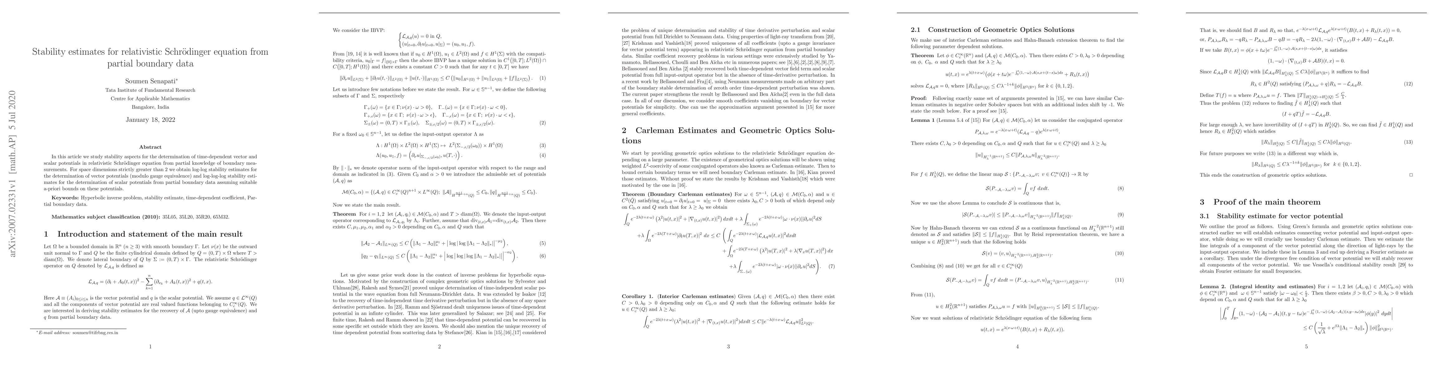 This paper investigates stability estimates for determining time-dependent vector and scalar potentials in the relativistic Schrödinger equation using partial boundary measurements. It provides log-log stability for vector potentials and log-log-log stability for scalar potentials in dimensions greater than 2, under suitable a-priori bounds.