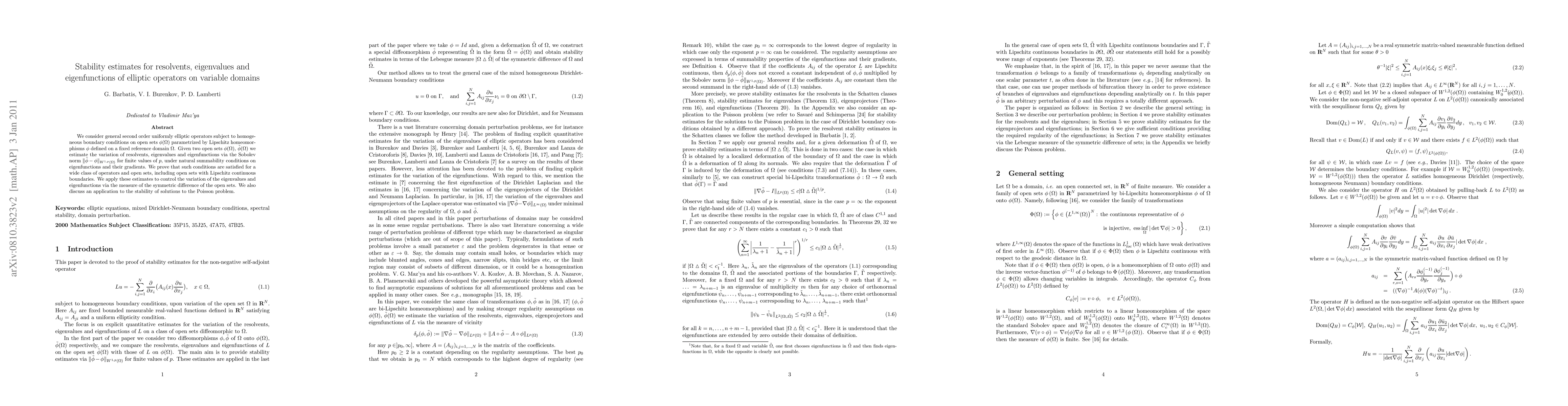 This paper provides stability estimates for resolvents, eigenvalues, and eigenfunctions of elliptic operators on variable domains, estimating their variation via the Sobolev norm of the domain transformation. It proves that these estimates hold under natural summability conditions, applicable to a broad class of operators and domains, including those with Lipschitz boundaries, and discusses implications for the stability of solutions to the Poisson problem.