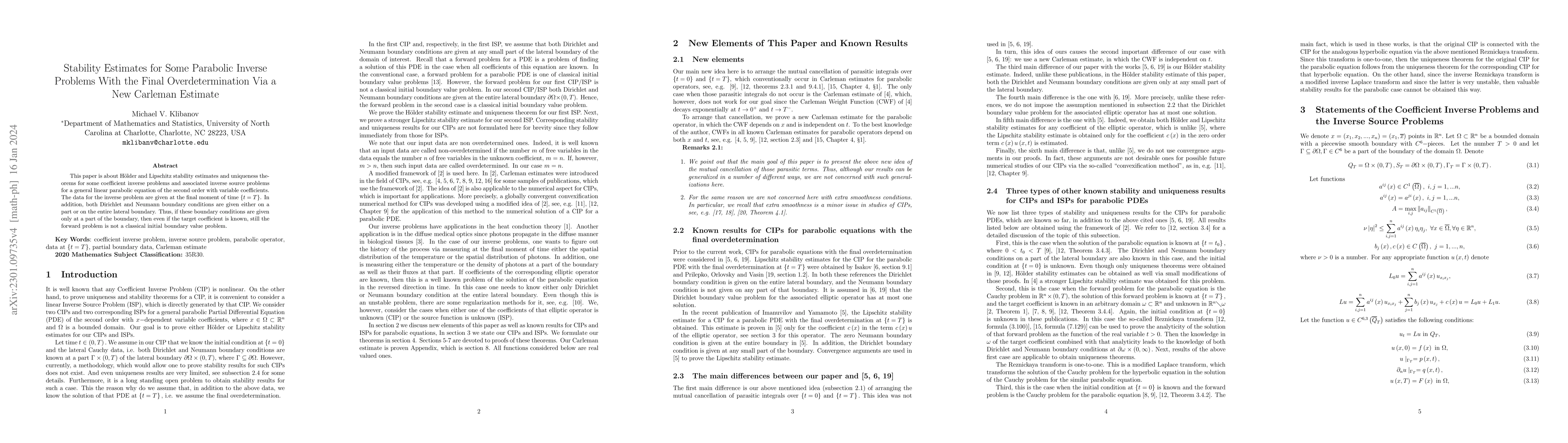 This paper is about Holder and Lipschitz stability estimates and uniqueness theorems for some coefficient inverse problems and associated inverse source problems for a general linear parabolic equation of the second order with variable coefficients. The data for the inverse problem are given at the final moment of time {t=T}. In addition, both Dirichlet and Neumann boundary conditions are given either on a part or on the entire lateral boundary. Thus, if these boundary conditions are given only at a part of the boundary, then even if the target coefficient is known, still the forward problem is not a classical initial boundary value problem.