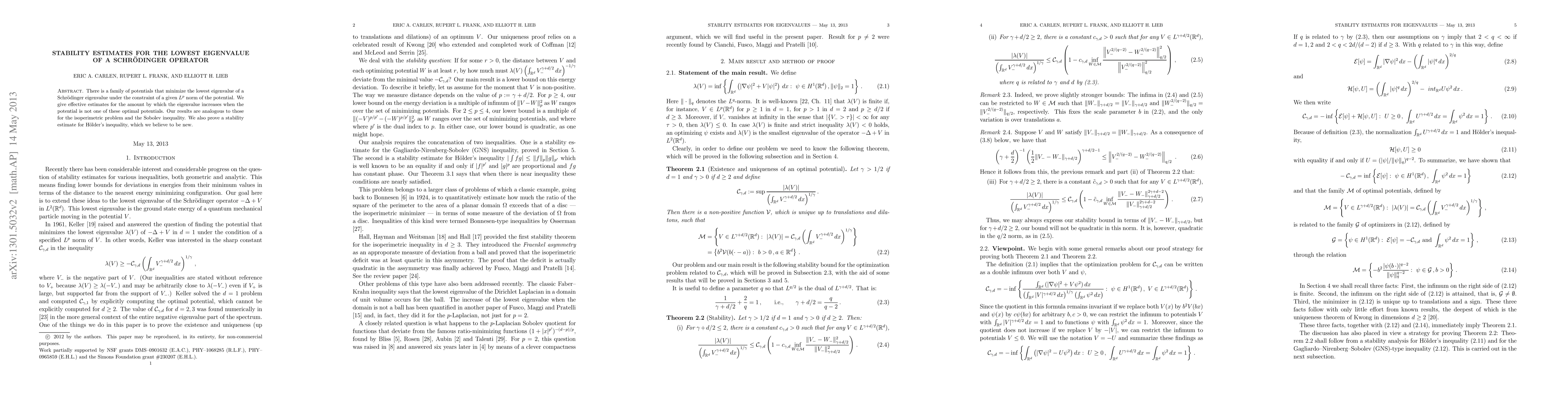 There is a family of potentials that minimize the lowest eigenvalue of a Schr\"odinger eigenvalue under the constraint of a given L^p norm of the potential. We give effective estimates for the amount by which the eigenvalue increases when the potential is not one of these optimal potentials. Our results are analogous to those for the isoperimetric problem and the Sobolev inequality. We also prove a stability estimate for H\"older's inequality, which we believe to be new.