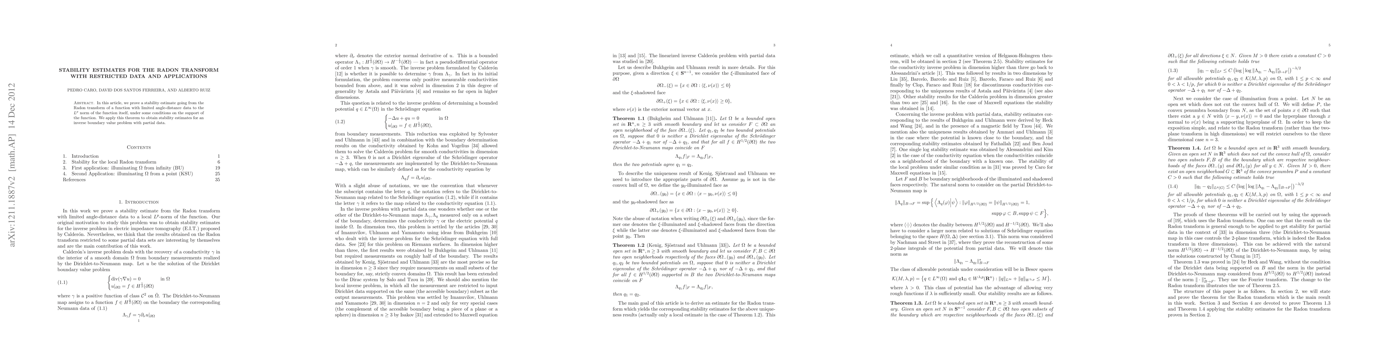 In this article, we prove a stability estimate going from the Radon transform of a function with limited angle-distance data to the $L^p$ norm of the function itself, under some conditions on the support of the function. We apply this theorem to obtain stability estimates for an inverse boundary value problem with partial data.