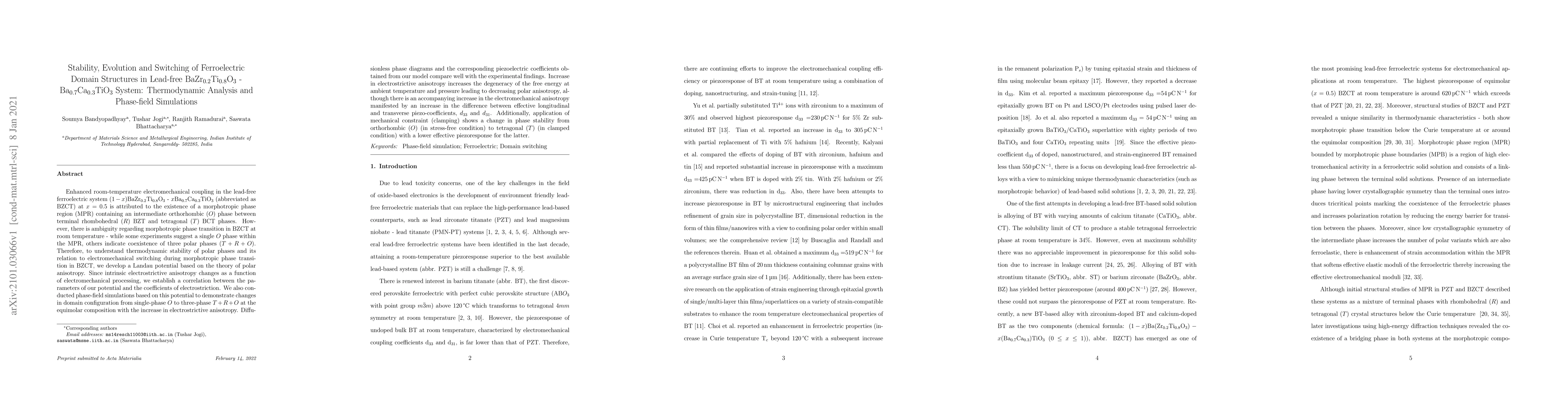 Researchers studied the stability and evolution of ferroelectric domain structures in a lead-free material system at room temperature, finding an intermediate orthorhombic phase that enhances electromechanical coupling.