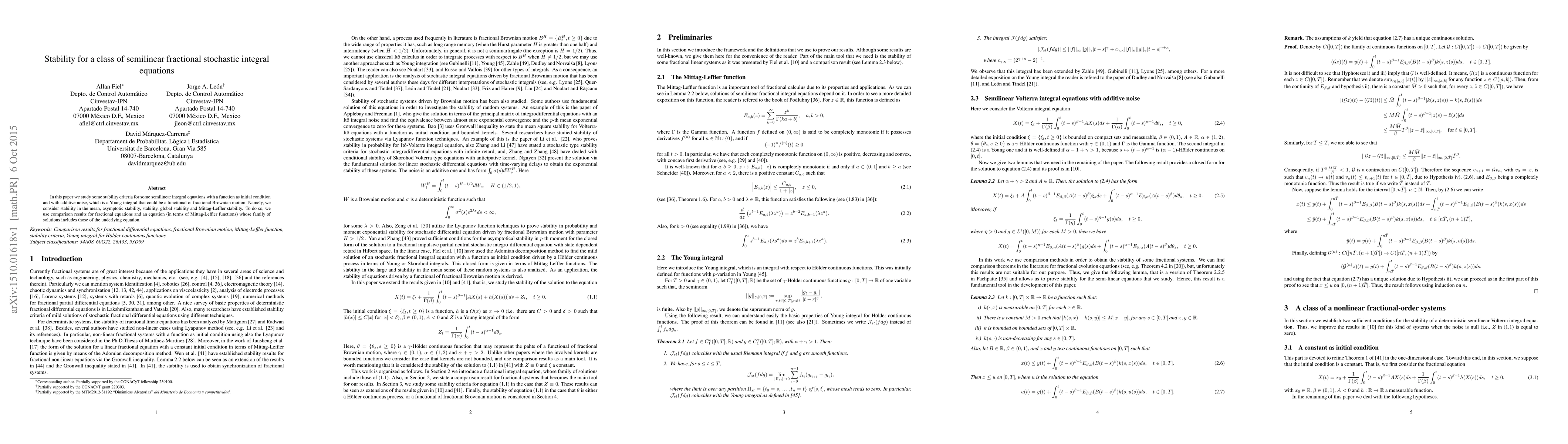In this paper we study some stability criteria for some semilinear integral equations with a function as initial condition and with additive noise, which is a Young integral that could be a functional of fractional Brownian motion. Namely, we consider stability in the mean, asymptotic stability, stability, global stability and Mittag-Leffler stability. To do so, we use comparison results for fractional equations and an equation (in terms of Mittag-Leffler functions) whose family of solutions includes those of the underlying equation.