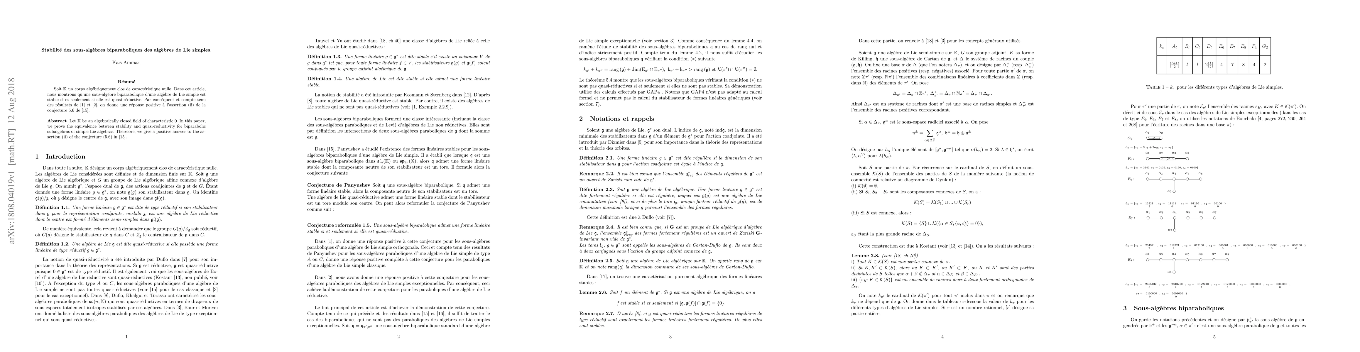 This paper proves that biparabolic subalgebras of simple Lie algebras are stable, answering a conjecture by Panyushev about the equivalence between stability and quasi-reductivity for these types of Lie algebras.