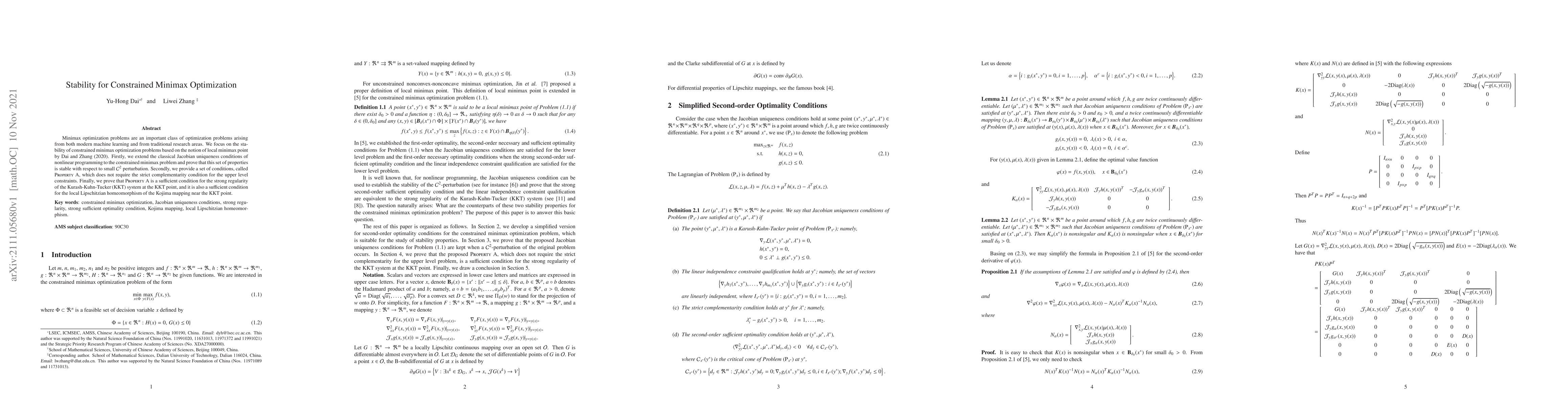 Minimax optimization problems are an important class of optimization problems arising from both modern machine learning and from traditional research areas. We focus on the stability of constrained minimax optimization problems based on the notion of local minimax point by Dai and Zhang (2020). Firstly, we extend the classical Jacobian uniqueness conditions of nonlinear programming to the constrained minimax problem and prove that this set of properties is stable with respect to small $C^2$ perturbation. Secondly, we provide a set of conditions, called Property A, which does not require the strict complementarity condition for the upper level constraints. Finally, we prove that Property A is a sufficient condition for the strong regularity of the Kurash-Kuhn-Tucker (KKT) system at the KKT point, and it is also a sufficient condition for the local Lipschitzian homeomorphism of the Kojima mapping near the KKT point.