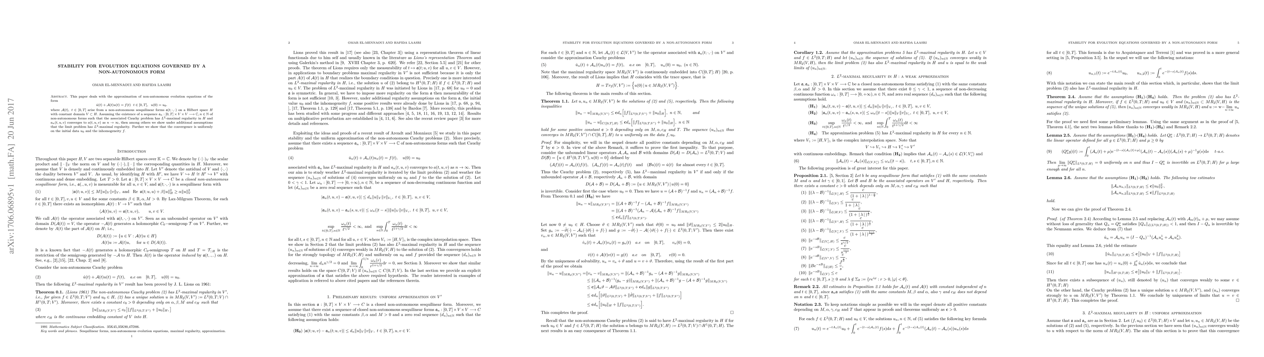 This paper deals with the approximation of non-autonomous evolution equations of the form \begin{equation*}\label{Abstract equation} \dot u(t)+A(t)u(t)=f(t)\ \ t\in[0,T],\ \ u(0)=u_0. \end{equation*} where $A(t),\ t\in [0,T]$ arise from a non-autonomous sesquilinear forms $\mathfrak a(t;\cdot,\cdot)$ on a Hilbert space $H$ with constant domain $V\subset H.$ Assuming the existence of a sequence $\mathfrak a_n:[0,T]\times V\times V\longrightarrow\mathbb C, n\in \mathbb N$ of non-autonomous forms such that the associated Cauchy problem has $L^2$-maximal regularity in $H$ and $\mathfrak a_n(t,u,v)$ converges to $\mathfrak a(t,u,v)$ as $n\to \infty,$ then among others we show under additional assumptions that the limit problem has $L^2$-maximal regularity. Further we show that the convergence is uniformly on the initial data $u_0$ and the inhomogeneity $f.$