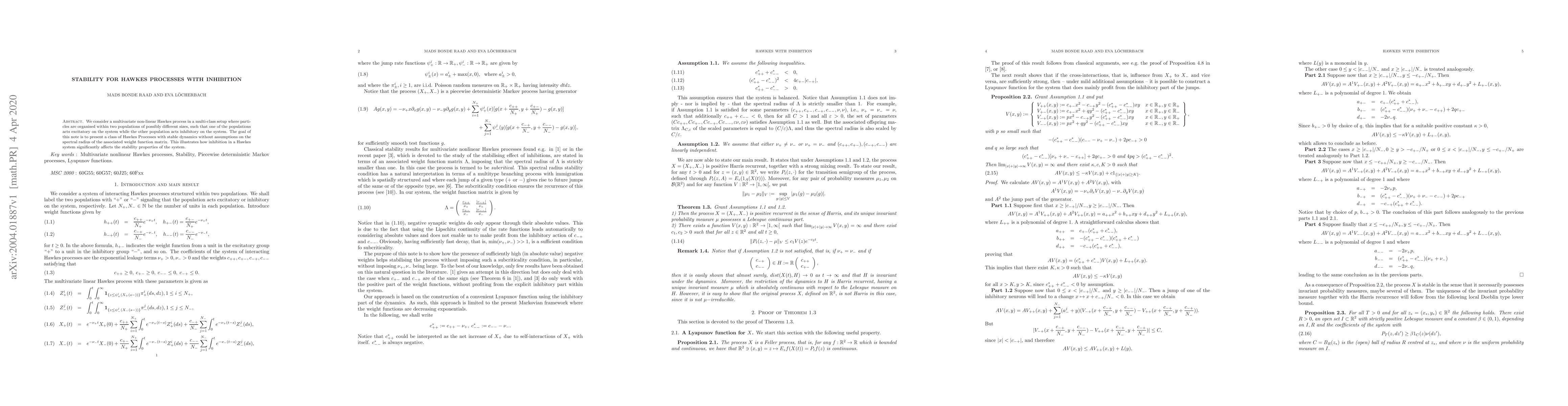 We consider a multivariate non-linear Hawkes process in a multi-class setup where particles are organised within two populations of possibly different sizes, such that one of the populations acts excitatory on the system while the other population acts inhibitory on the system. The goal of this note is to present a class of Hawkes Processes with stable dynamics without assumptions on the spectral radius of the associated weight function matrix. This illustrates how inhibition in a Hawkes system significantly affects the stability properties of the system.