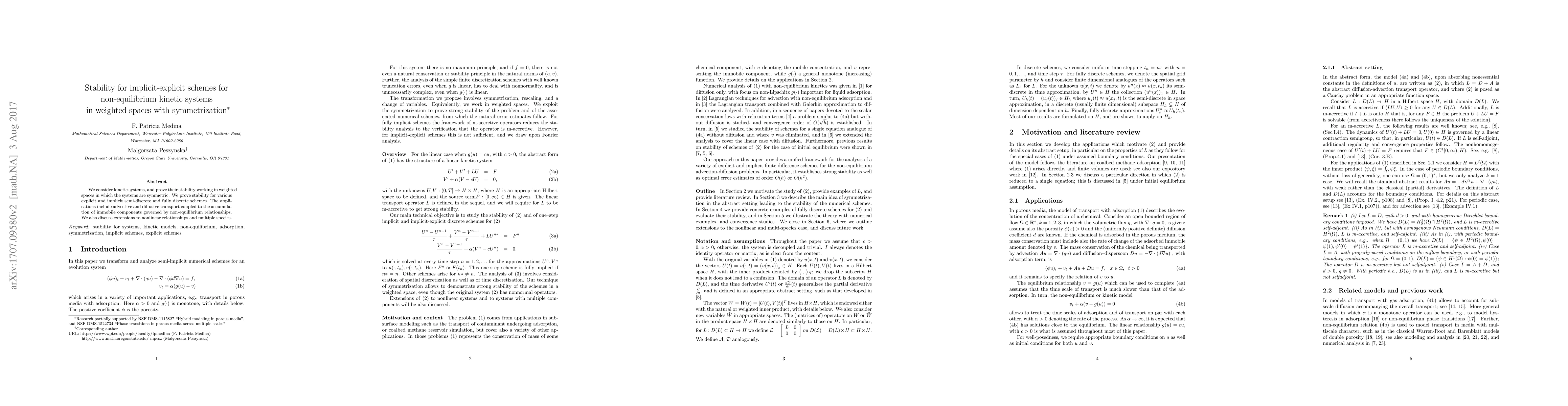 We consider kinetic systems and prove their stability working in weighted spaces in which the systems are symmetric. We prove stability for various explicit and implicit semi-discrete and fully discrete schemes. The applications include advective and diffusive transport coupled to the accumulation of immobile components governed by non-equilibrium relationships. We also discuss extensions to nonlinear relationships and multiple species.